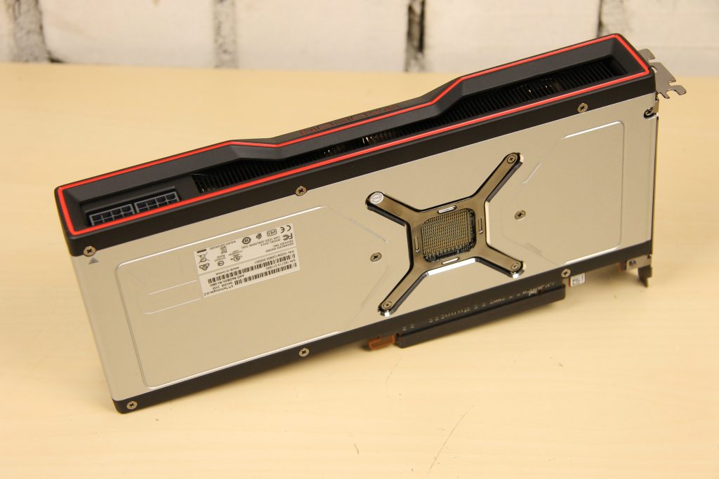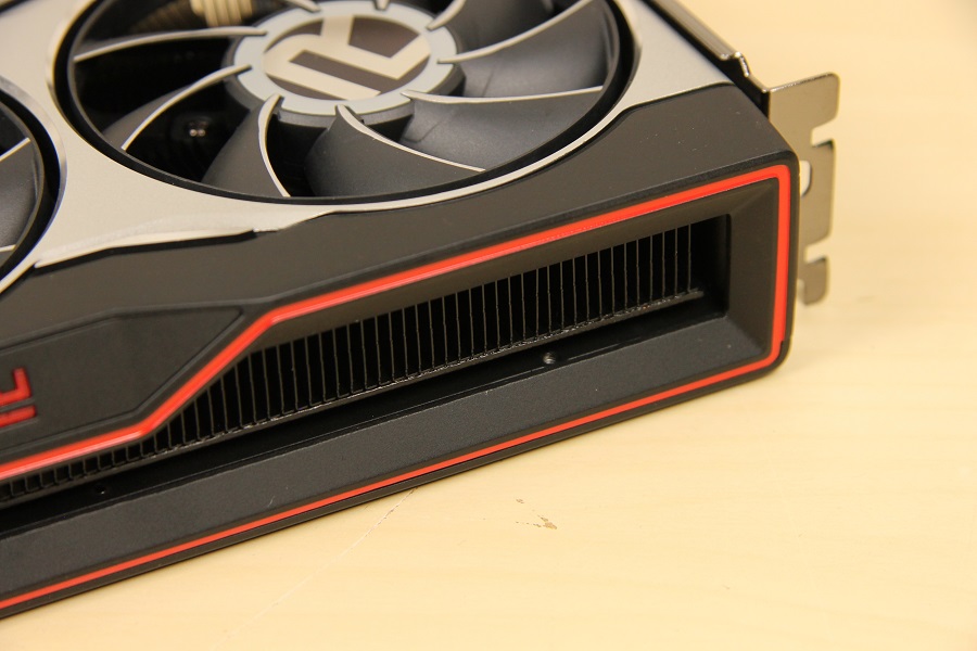 Als we de kaart gaan bekijken dan zien we dat deze in twee kleuren is uitgevoerd namelijk zwart en aluminium. Persoonlijk vind ik de looks van deze kaart erg netjes. Het hoeft niet altijd raak te zijn met verschillende kleuren en RGB verlichting. Een beetje een stijlvolle kaart kan ook mooi zijn in een pc build. Verder voelt de kaart ook solide aan. Je krijgt niet het idee dat de koeler er elk moment vanaf kan vallen. Dat geeft ook wel het gevoel van kwaliteit. Boven het logo zien we trouwens nog een rode lijn, een element die weer verwijst naar de kleurstelling van AMD (het is niet voor niets allemaal rood). Verder is er geen poespas terug te zien op de kaart, het is echt “what you see is what you get”.