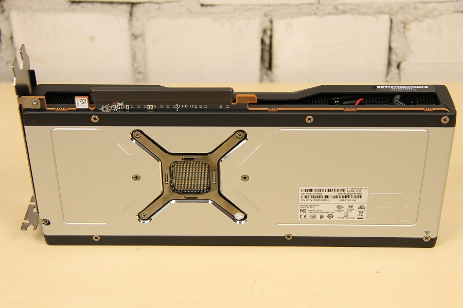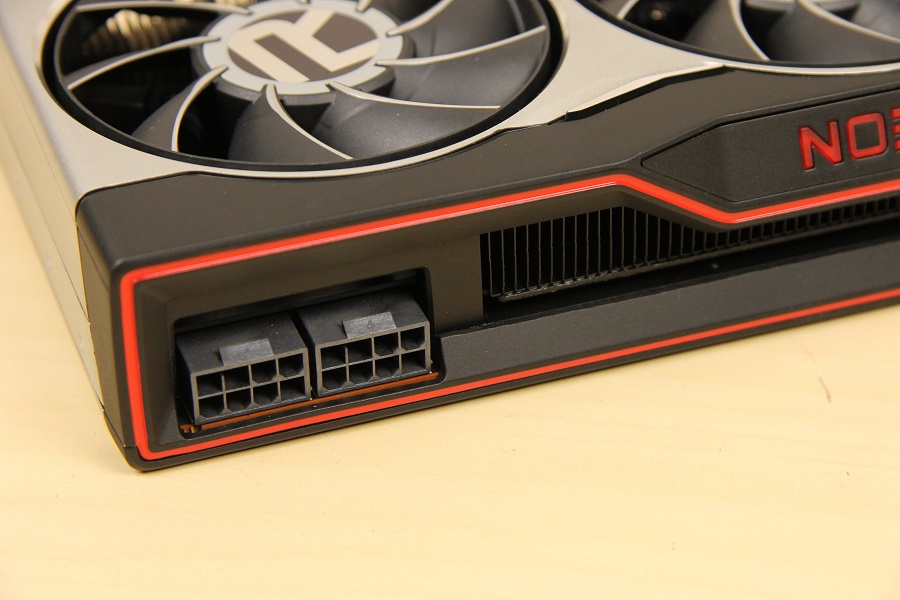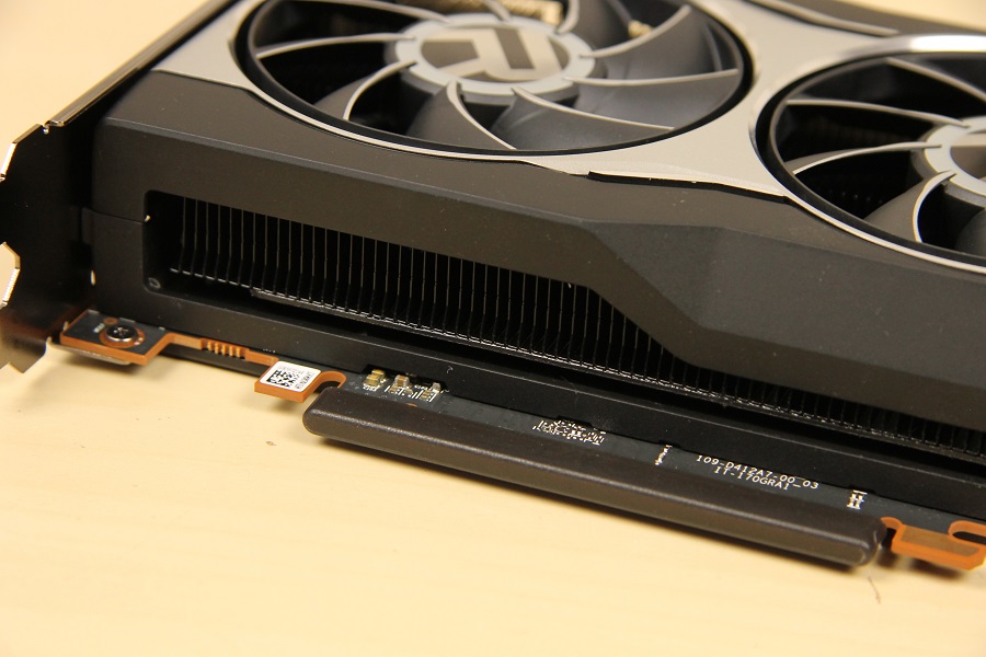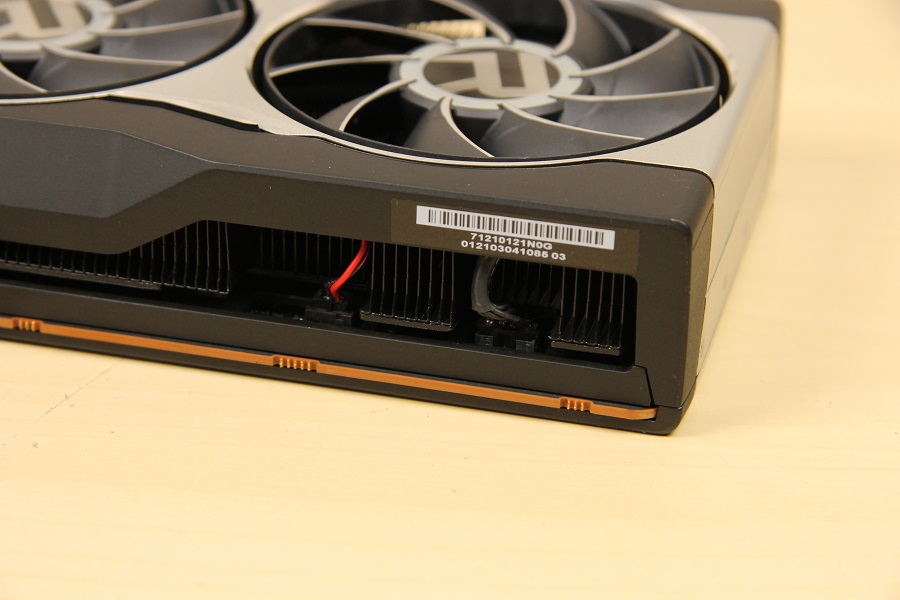 Tussen het PCB en de ventilatoren zitten de koelribben van het koelblok. Deze moeten zorgen dat de warmte weggeleid wordt van de GPU en met behulp van de ventilatoren afgevoerd wordt naar de computerkast. De koelribben zijn ook netjes in het zwart uitgevoerd in tegenstelling tot sommige andere koelblokken. Afwerking is wel iets waar AMD over nagedacht heeft. Rechts onderin zitten de aansluitingen voor de ventilatoren en de verlichting terwijl rechts bovenop de kaart de twee aansluitingen zitten die de kaart van extra stroom moeten voorzien. Aangezien het PCIe slot maximaal 75 Watt kan leveren zijn extra connectoren wel nodig.