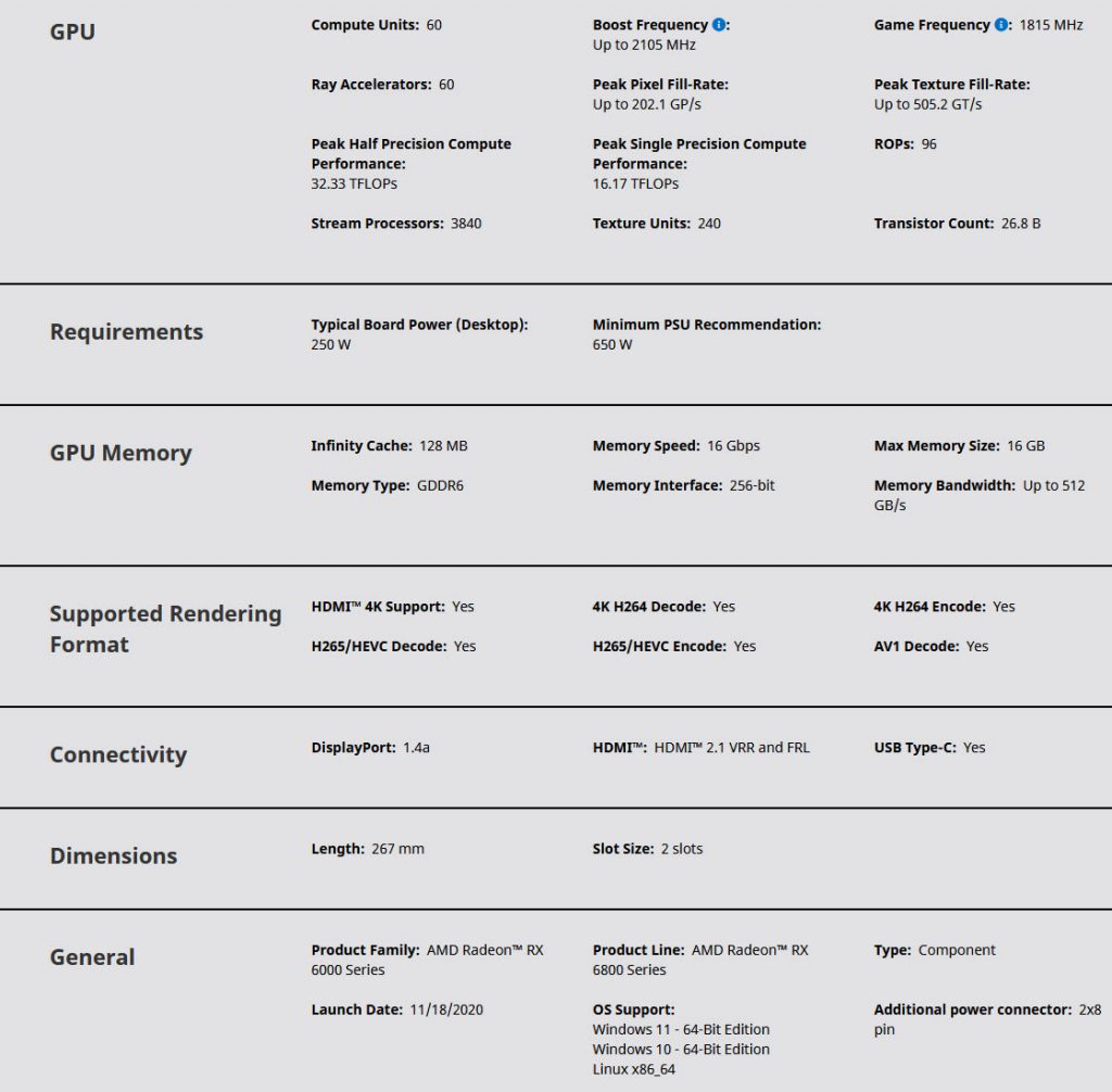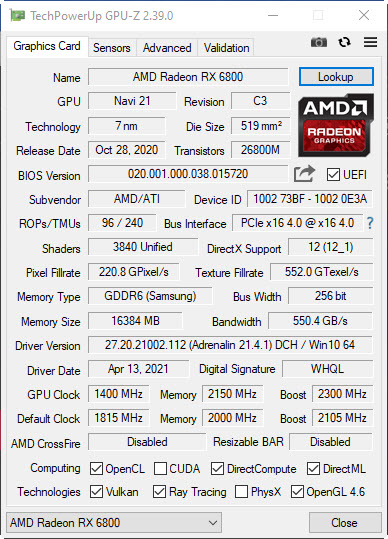 De RX 6800 is gebaseerd op de Navi 21 GPU. Er zijn op deze GPU normaal gesproken 80 Compute Units aanwezig. Op de 6900XT zijn alle units ingeschakeld maar op deze kaart zijn er maar 60 ingeschakeld. De chip werkt dus maar op 75% van de maximale capaciteit. Er zijn 3840 Stream Processoren aanwezig en 240 Texture Units. De kloksnelheid van deze kaart ligt op 1815 MHz terwijl de kaart kan boosten naar 2105 MHz wanneer het echt nodig is. Er is 16GB aan geheugen geplaatst met een snelheid van 16 Gbps. Dit is dezelfde snelheid als de eerder gereviewde 6900 XT. De kaart zou volgens de specificaties maximaal 250 Watt verbruiken en er wordt een voeding geadviseerd van 650 Watt. Dit is natuurlijk wel wanneer de rest van het systeem ook flink wat stroom verbruikt. Heb je een zuiniger systeem dan is een 550 Watt voeding ook al prima.