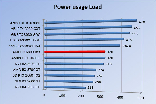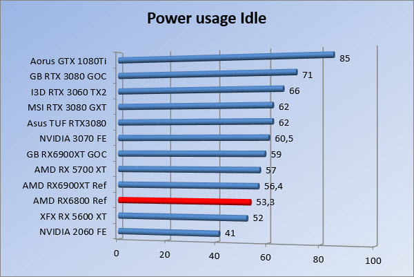 Het verbruik van de kaart wordt op twee manieren gemeten. De software van AMD en GPU-Z laten waardes zien van de kaart zelf maar er wordt ook gemeten bij het stopcontact door gebruik te maken van een Voltcraft Energy Check 3000. Gebeurt er niets dan wordt er maar 53 Watt in totaal verbruikt, waarvan maar 5 Watt door de videokaart. Zetten we Furmark aan dan stijgt het vebruik naar 301,4 Watt waarvan 203 Watt toe te wijzen is aan de videokaart. Dit stijgt overigens naar 320 Watt als Doom Eternal gestart wordt. Dat de kaart nog meer kan verstoken blijkt wanneer de Furmark weer starten maar dan als de kaart overgeklokt is. Er wordt bij het stopcontact maar liefst 340 Watt gemeten waarvan de kaart zo’n 233 Watt pakt. Qua stroomverbruik zit hij dus in lijn met de 3070 kaart.
