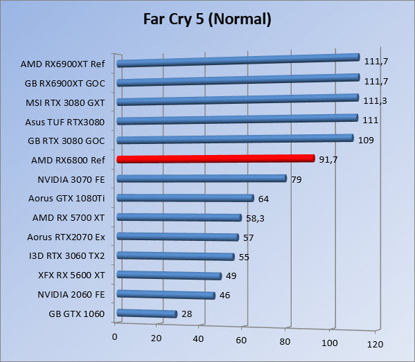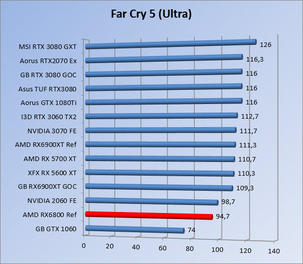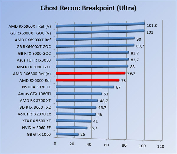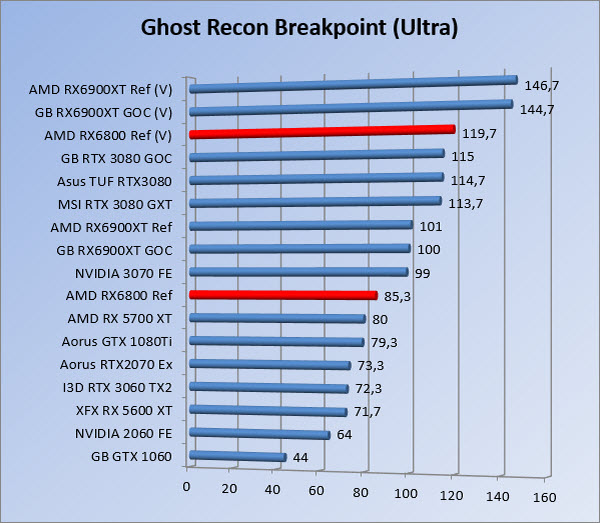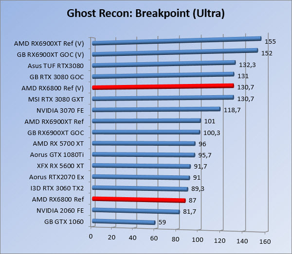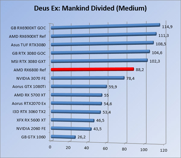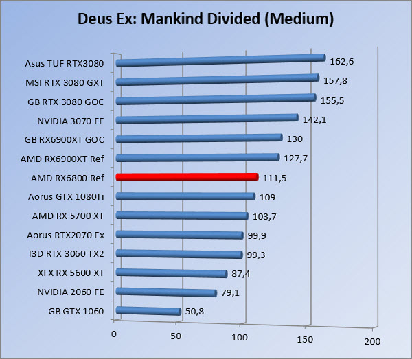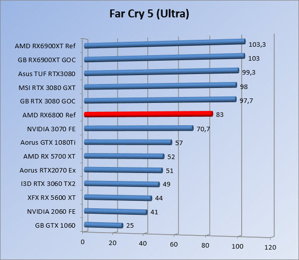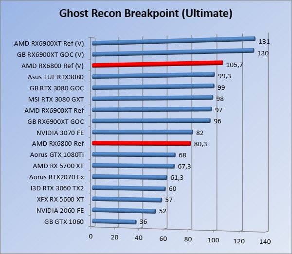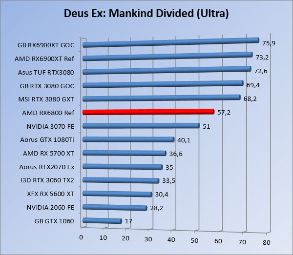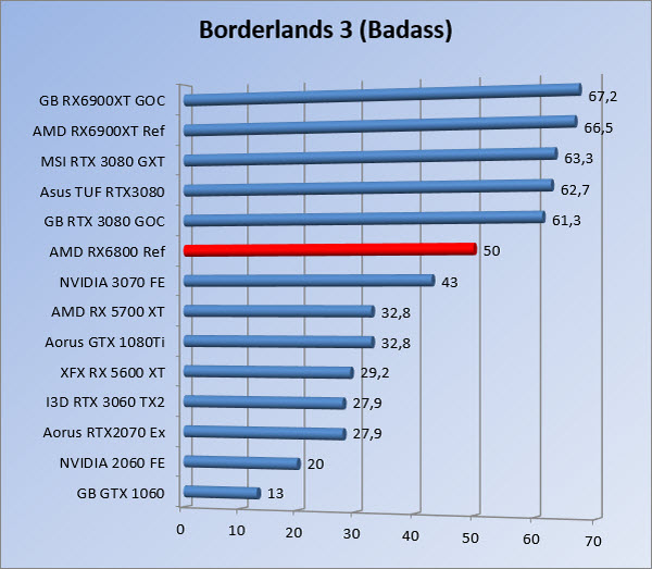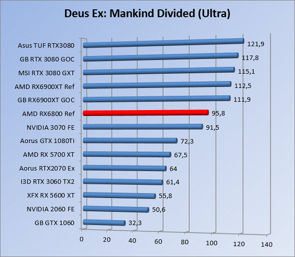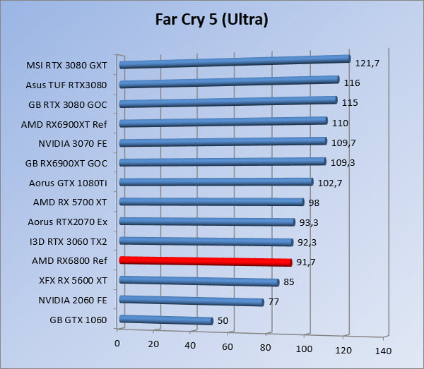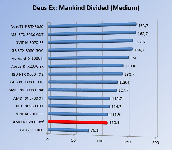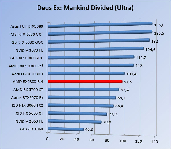 Qua synthetische prestaties weet de kaart inderdaad de 3070 te verslaan. Bij de oudere tests weet de kaart zelfs in de buurt te komen van de RTX3080, bij de Time Spy tests is het verschil wat kleiner tussen de twee kaarten. In de Raytracing test weet de kaart echter niet beter te presteren en staat onder de 3070. In Super Position is het stuivertje wisselen. Ook in 1080p is het stuivertje wisselen, ook al komt dat over het algemeen door een CPU bottleneck. De kaart lijkt niet lekker te werken in een paar games, te weten Far Cry 5 en Deus Ex. Ook Ghost Recon heeft issues maar zodra we dit spel in de Vulcan API draaien zijn de prestaties een heel stuk beter. Pakken we de tests in 1440p dan zien we een soortgelijk resultaat: de ene keer wint de 6800, de andere keer de 3070. Pas in 4K staat de kaart boven de RTX 3070, behalve in de Raytracing tests. Het is echter bekend bij de AMD kaarten dat daar hun pijnpunt zit. De ene keer is het verschil nihil, de andere keer leunt het resultaat tegen de 3080 aan.