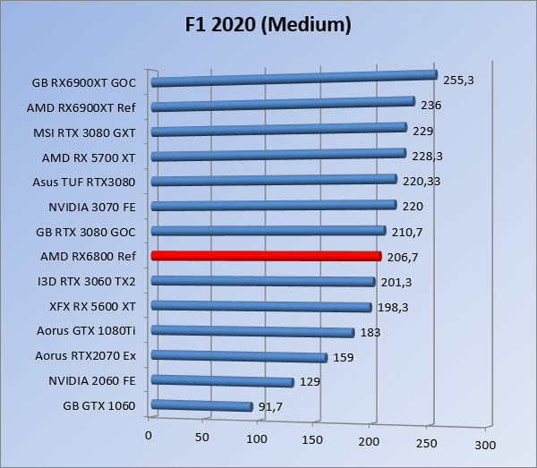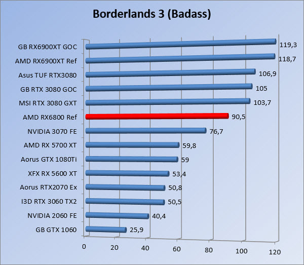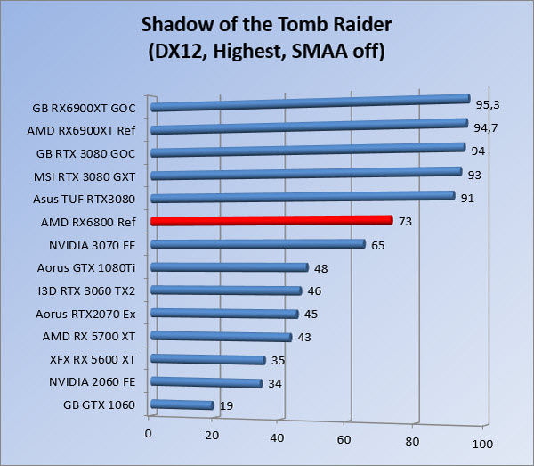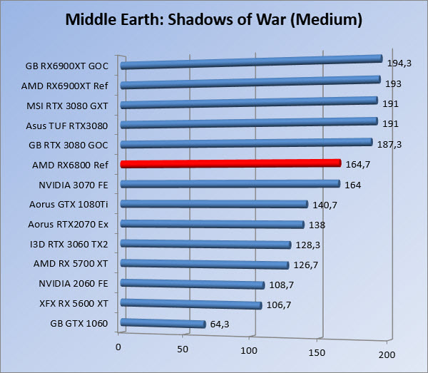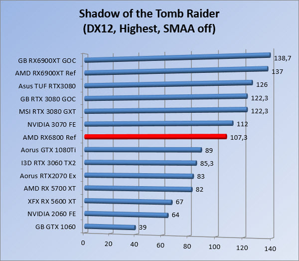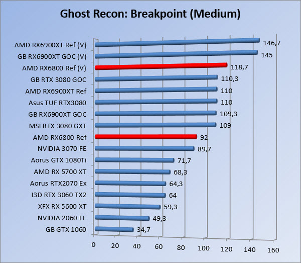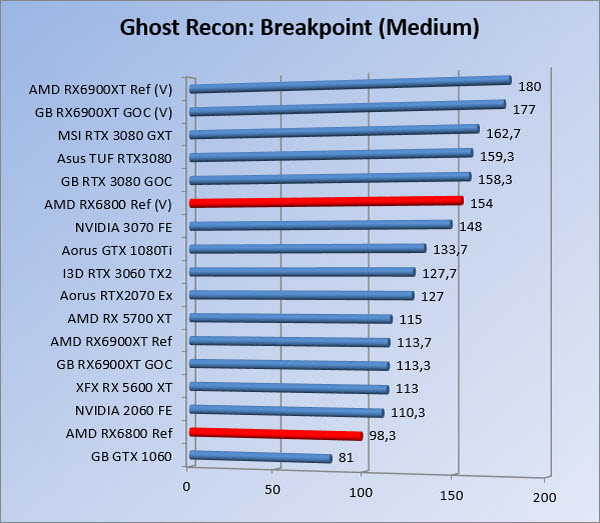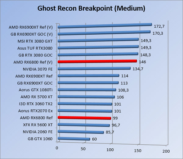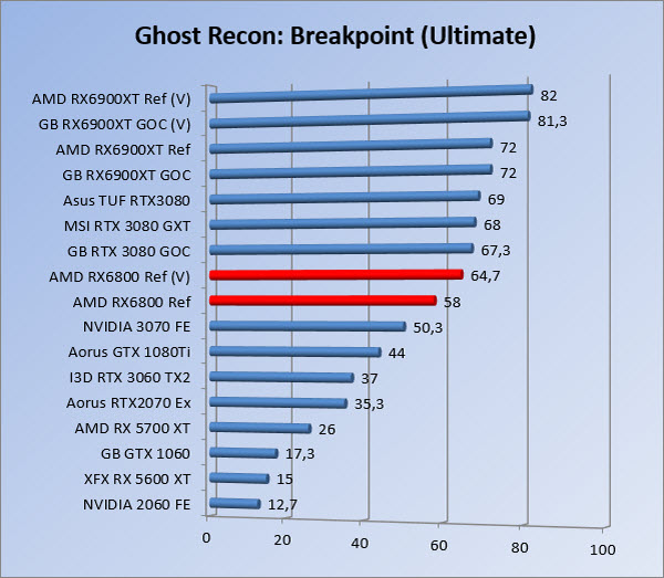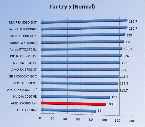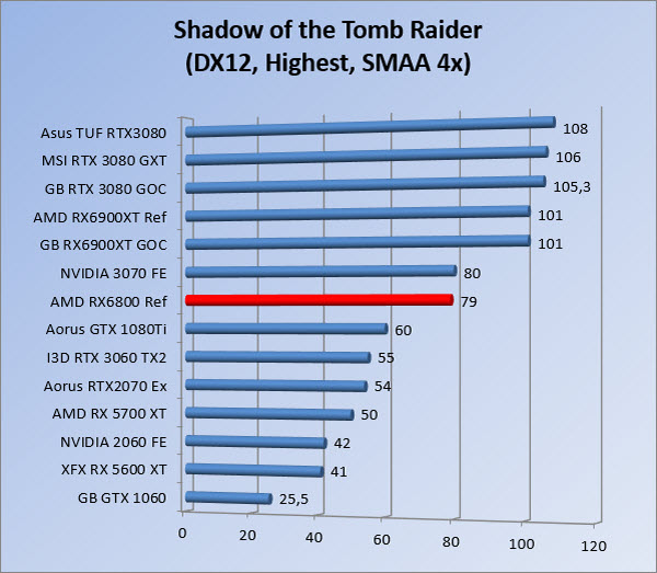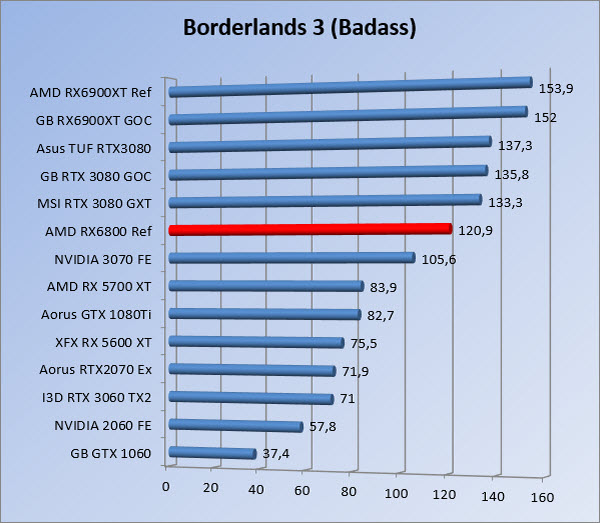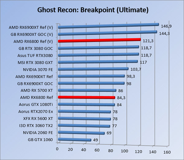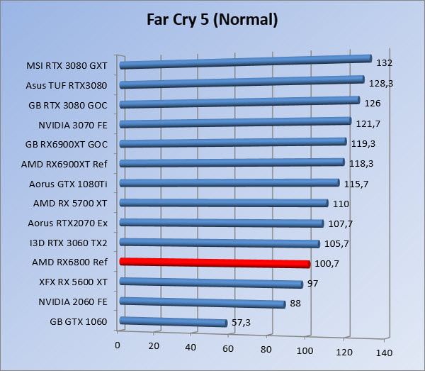 Qua synthetische prestaties weet de kaart inderdaad de 3070 te verslaan. Bij de oudere tests weet de kaart zelfs in de buurt te komen van de RTX3080, bij de Time Spy tests is het verschil wat kleiner tussen de twee kaarten. In de Raytracing test weet de kaart echter niet beter te presteren en staat onder de 3070. In Super Position is het stuivertje wisselen. Ook in 1080p is het stuivertje wisselen, ook al komt dat over het algemeen door een CPU bottleneck. De kaart lijkt niet lekker te werken in een paar games, te weten Far Cry 5 en Deus Ex. Ook Ghost Recon heeft issues maar zodra we dit spel in de Vulcan API draaien zijn de prestaties een heel stuk beter. Pakken we de tests in 1440p dan zien we een soortgelijk resultaat: de ene keer wint de 6800, de andere keer de 3070. Pas in 4K staat de kaart boven de RTX 3070, behalve in de Raytracing tests. Het is echter bekend bij de AMD kaarten dat daar hun pijnpunt zit. De ene keer is het verschil nihil, de andere keer leunt het resultaat tegen de 3080 aan.