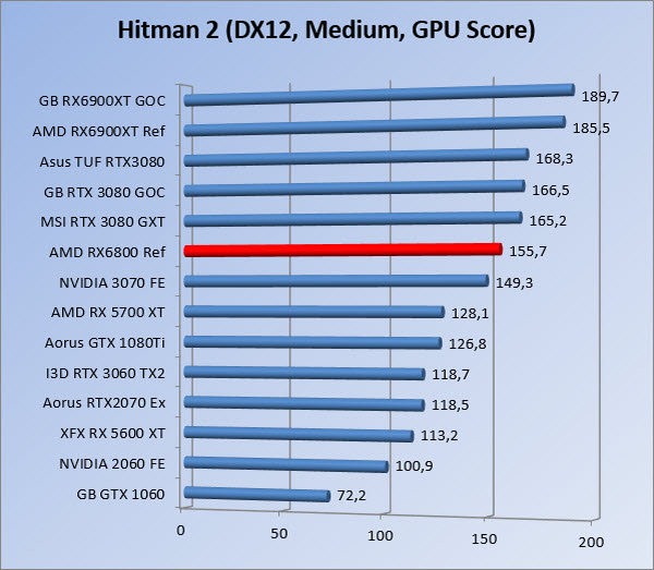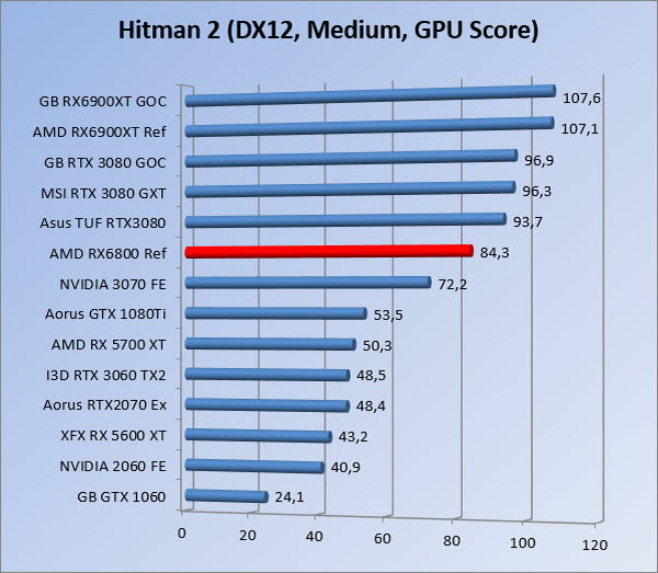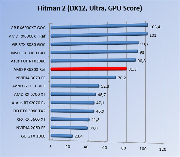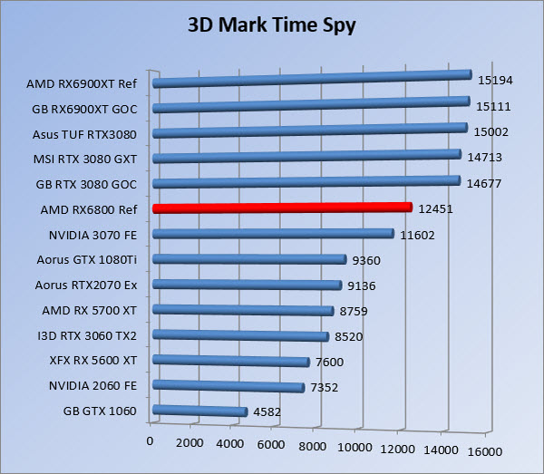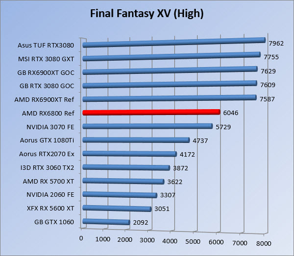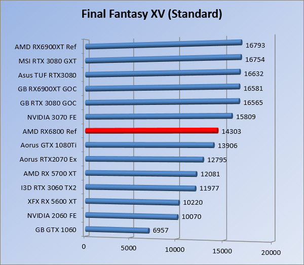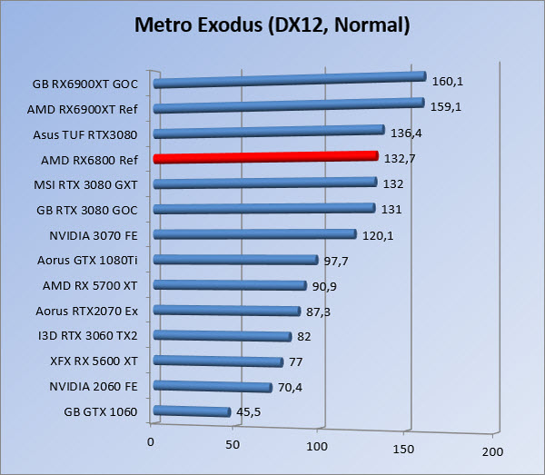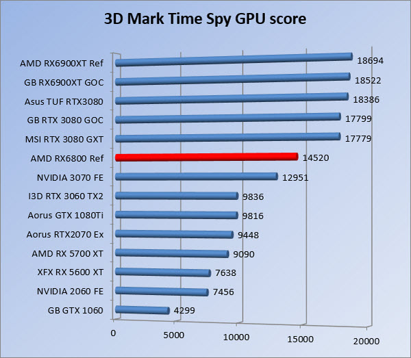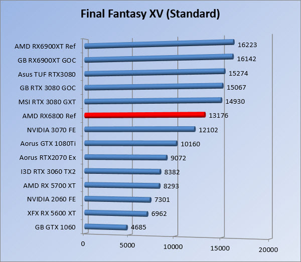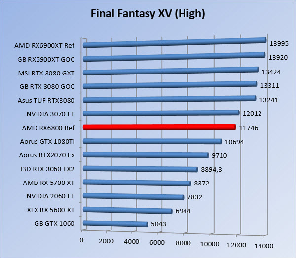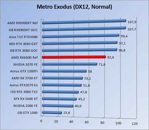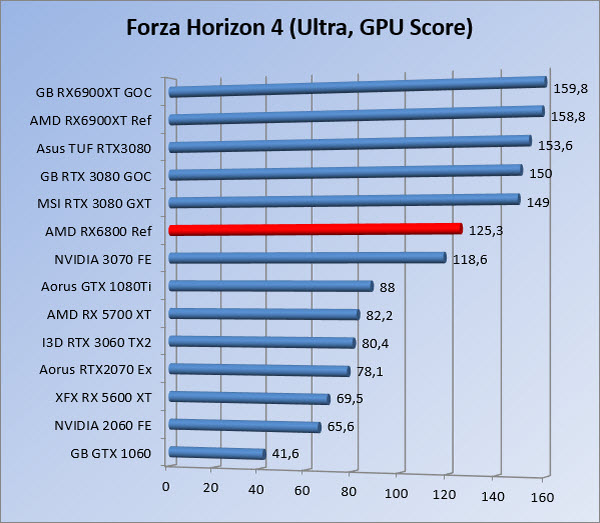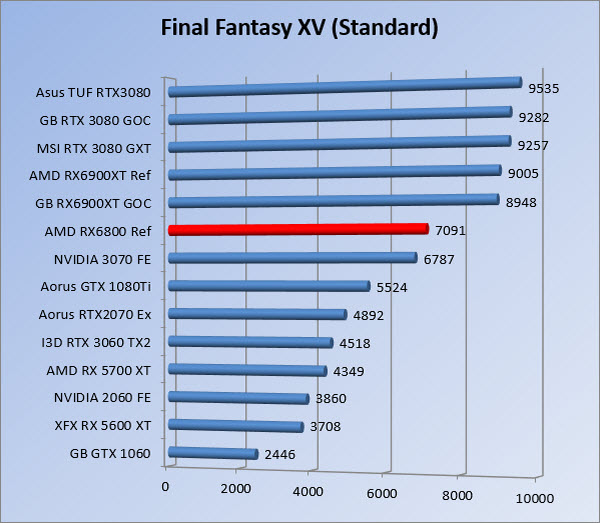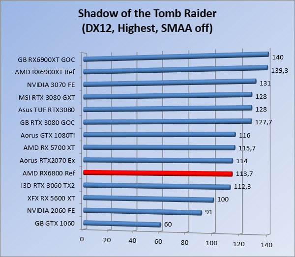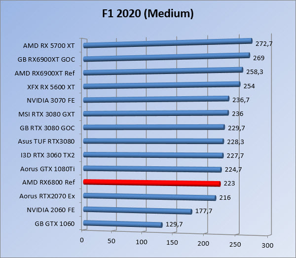 Qua synthetische prestaties weet de kaart inderdaad de 3070 te verslaan. Bij de oudere tests weet de kaart zelfs in de buurt te komen van de RTX3080, bij de Time Spy tests is het verschil wat kleiner tussen de twee kaarten. In de Raytracing test weet de kaart echter niet beter te presteren en staat onder de 3070. In Super Position is het stuivertje wisselen. Ook in 1080p is het stuivertje wisselen, ook al komt dat over het algemeen door een CPU bottleneck. De kaart lijkt niet lekker te werken in een paar games, te weten Far Cry 5 en Deus Ex. Ook Ghost Recon heeft issues maar zodra we dit spel in de Vulcan API draaien zijn de prestaties een heel stuk beter. Pakken we de tests in 1440p dan zien we een soortgelijk resultaat: de ene keer wint de 6800, de andere keer de 3070. Pas in 4K staat de kaart boven de RTX 3070, behalve in de Raytracing tests. Het is echter bekend bij de AMD kaarten dat daar hun pijnpunt zit. De ene keer is het verschil nihil, de andere keer leunt het resultaat tegen de 3080 aan.
