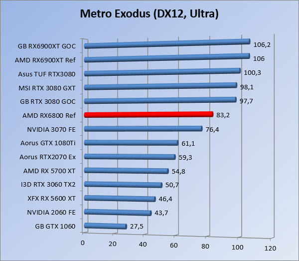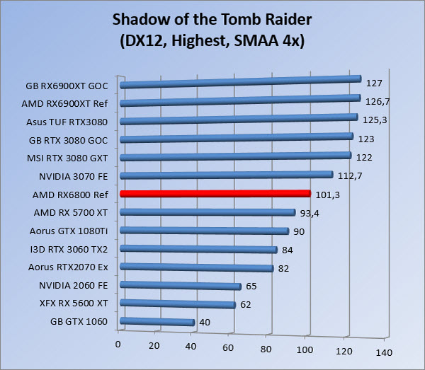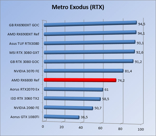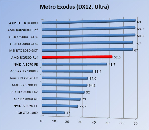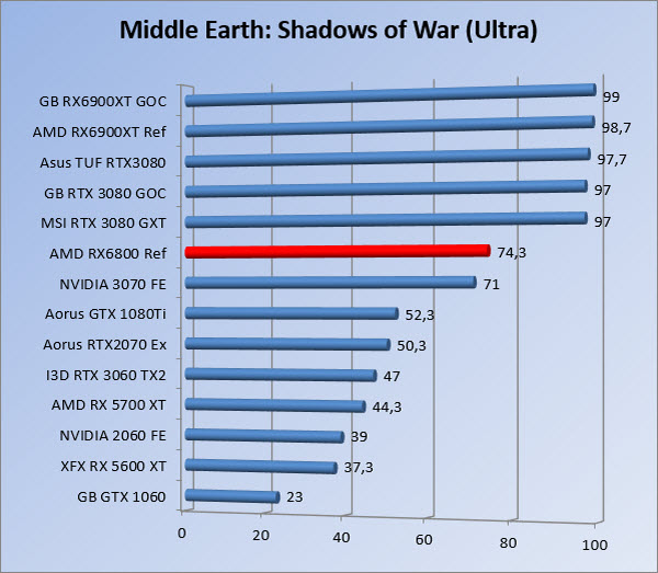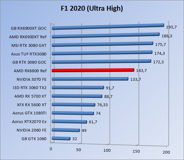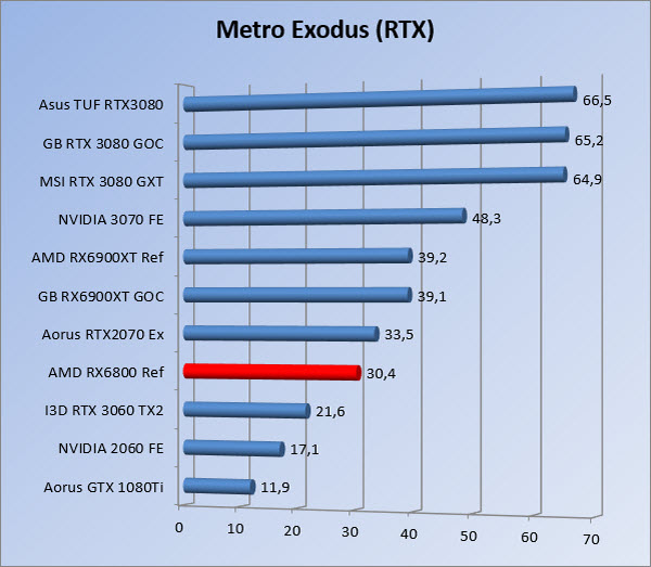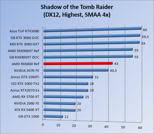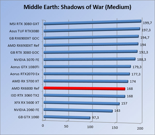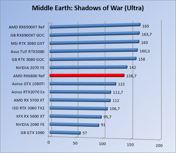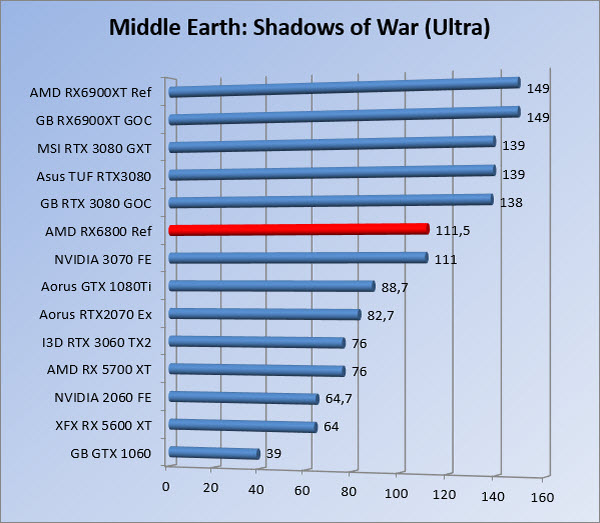 Schroeven we het geheel op naar 4K dan zien we dat de 3070 toch echt wel verslagen wordt, soms met een redelijk grote marge. Wel moet in het achterhoofd gehouden worden dat de 6800 wat duurder is dan de 3070 kaart: €519 vs €580. Dan mag je ook wel wat meer prestaties verwachten op de hoogste settings. Wat dat betreft doet de 16GB geheugen ook prima zijn werk. Ook hier geldt weer dat de Vulcan API echt het terrein van AMD is. Op ultimate wordt de 3080 bijna verslagen, niet slecht voor een kaart die toch wat goedkoper is. Raytracing is echter het pijnpunt weer van AMD: De kaart komt niet eens in de buurt van een 2070, een kaart uit de vorige generatie.