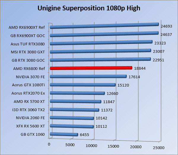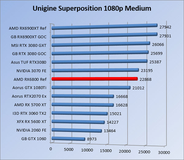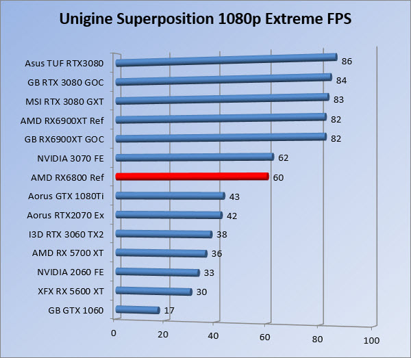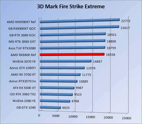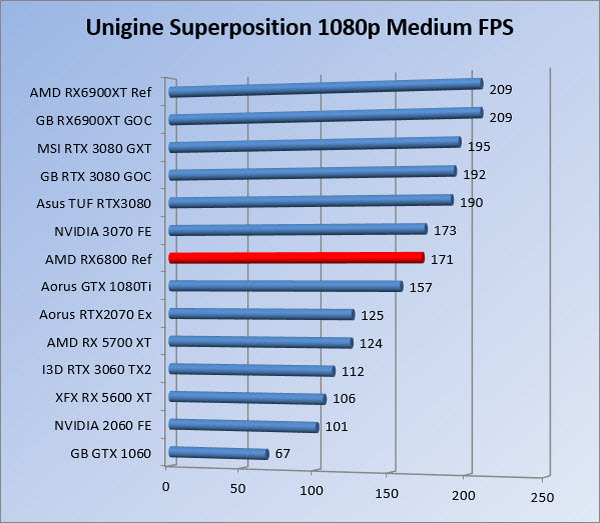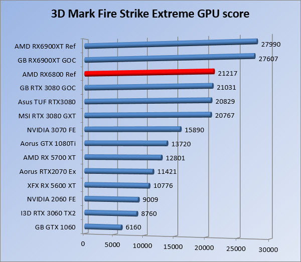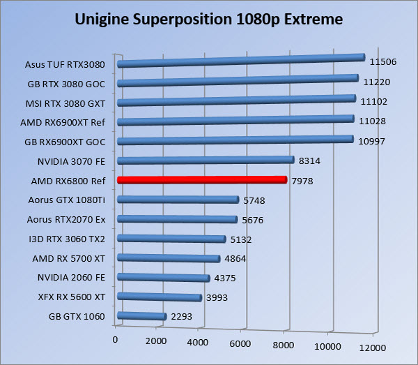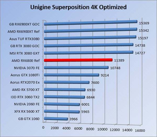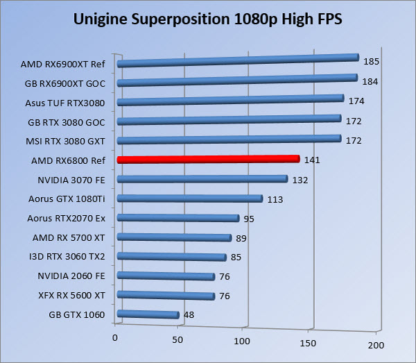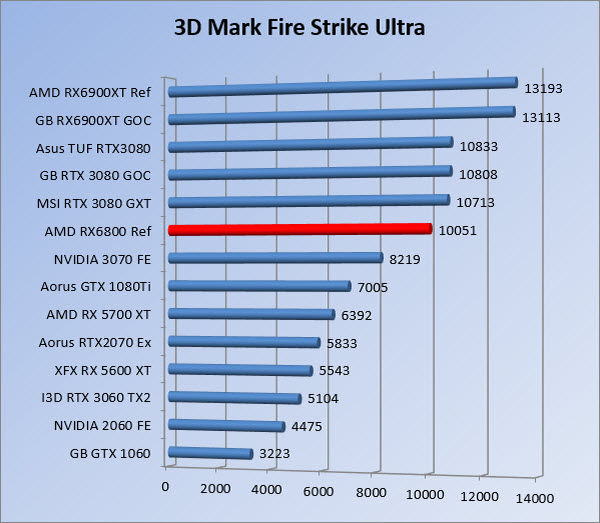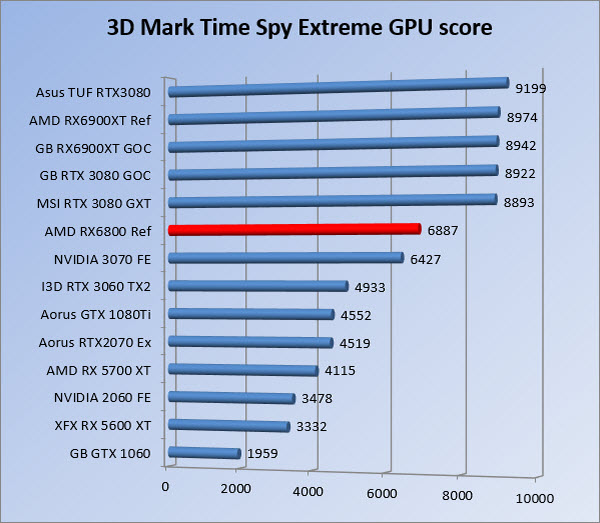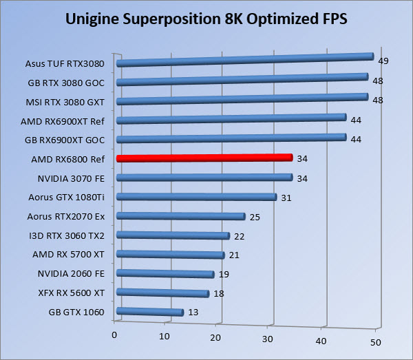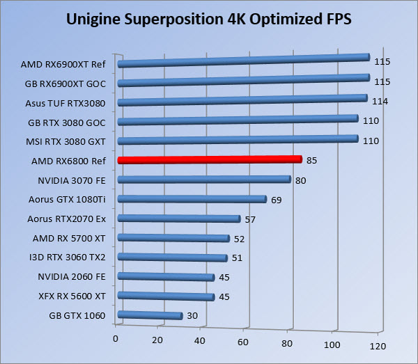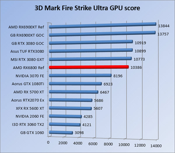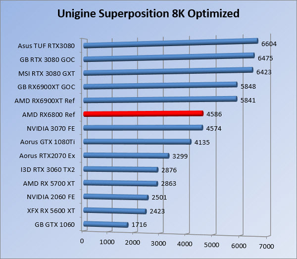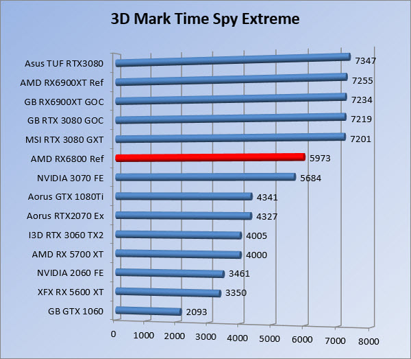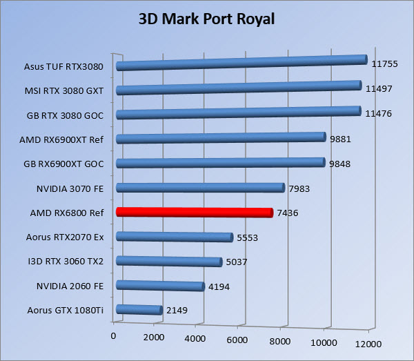 In zowel Fire strike als in Time Spy weet de 6800 kaart de 3070 van NVIDIA achter zich te houden. In Fire Strike komt de kaart zelfs in de buurt van de 3080 kaart wat een keurige prestatie is. In Time Spy zit deze kaart precies tussen de NVIDIA kaarten in. Bij Superposition is het stuivertje wisselen tussen deze twee kaarten: de ene keer is de kaart uit het groene kamp sneller, de andere keer is het de kaart uit het rode kamp. Als we nog even kijken naar Port Royal dan wordt pijnlijk duidelijk dat NVIDIA hier toch de betere kaarten voor heeft op het moment. De 6800 kan niet bij de 3070 in de buurt komen.