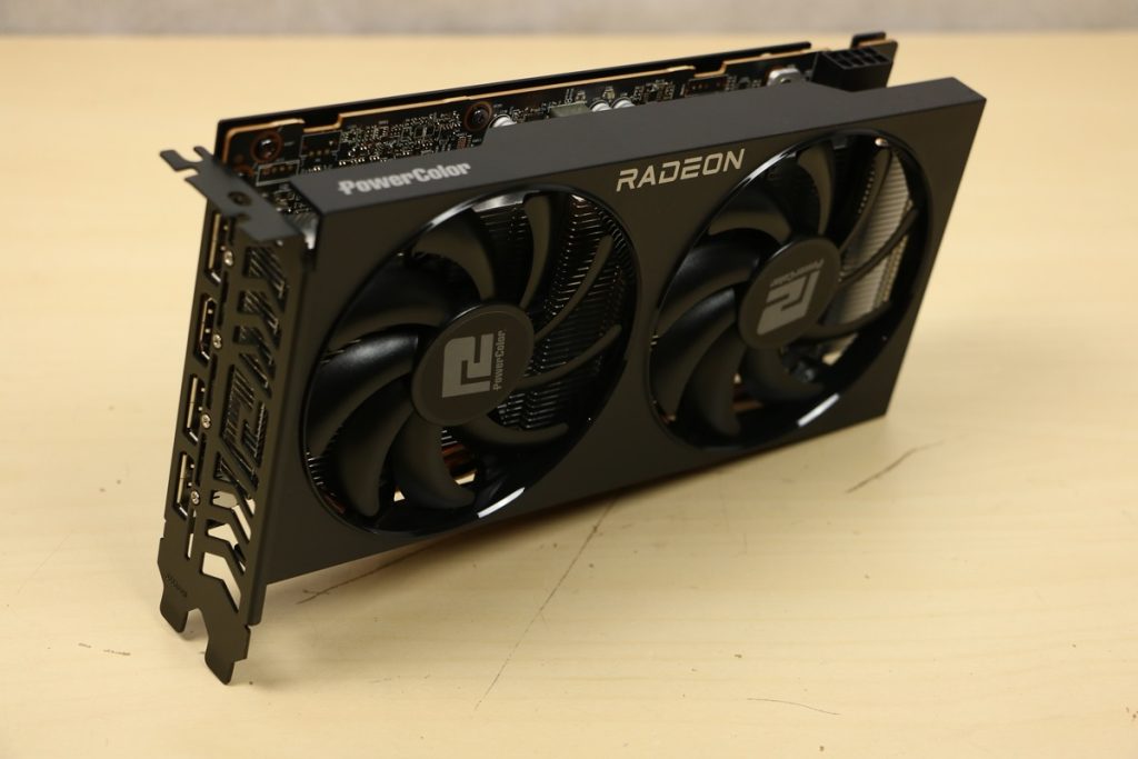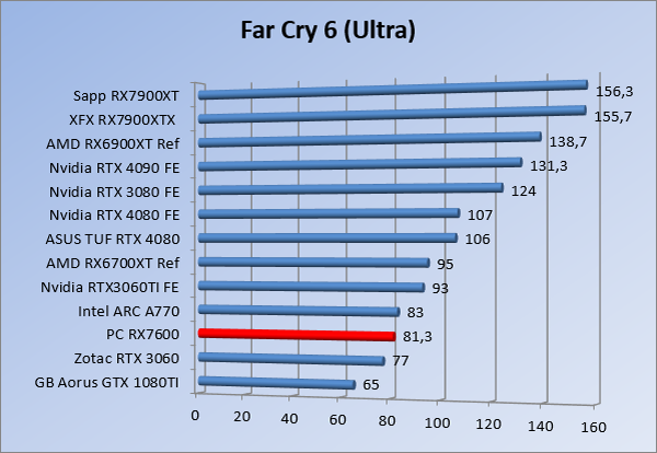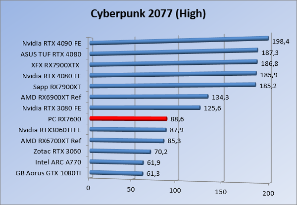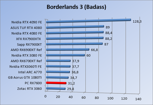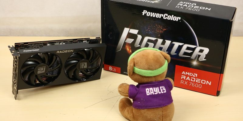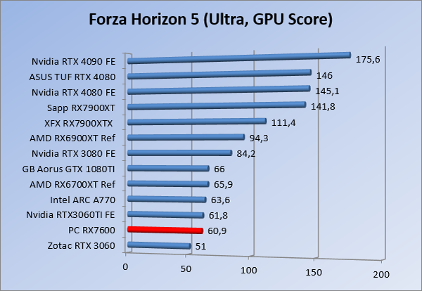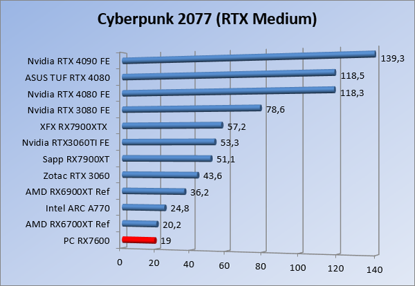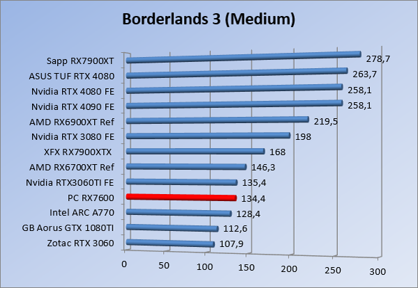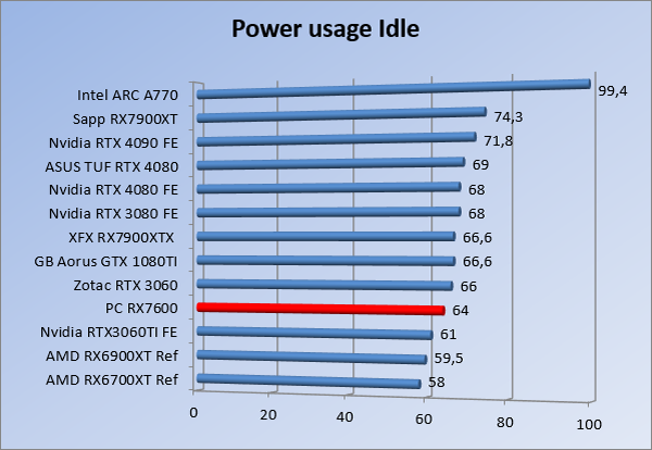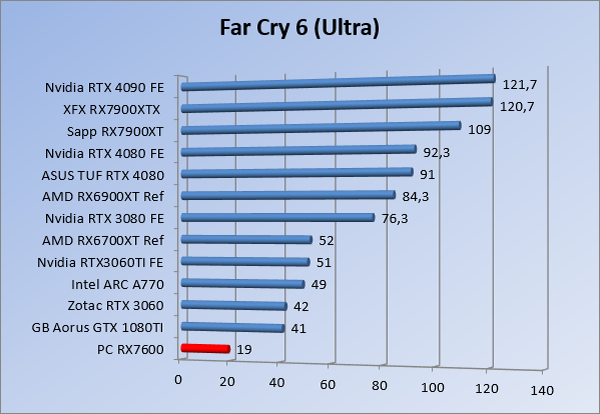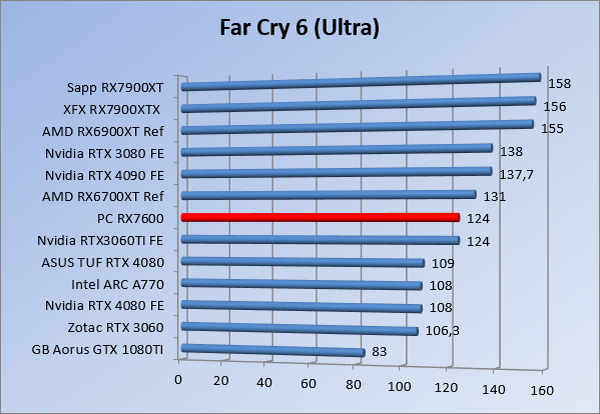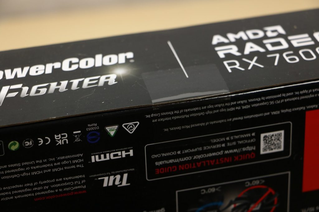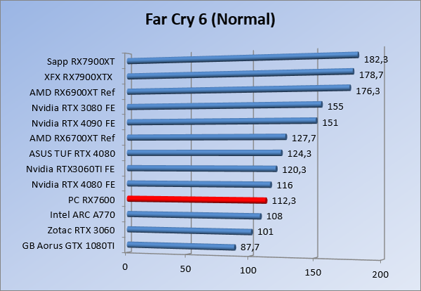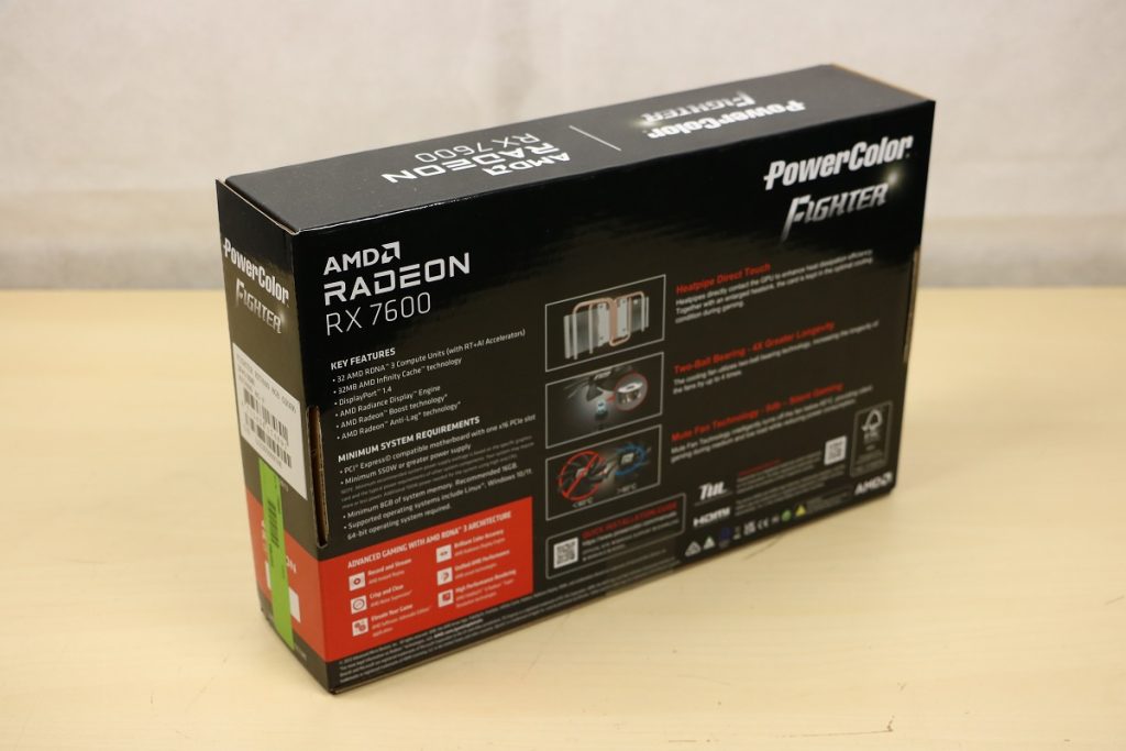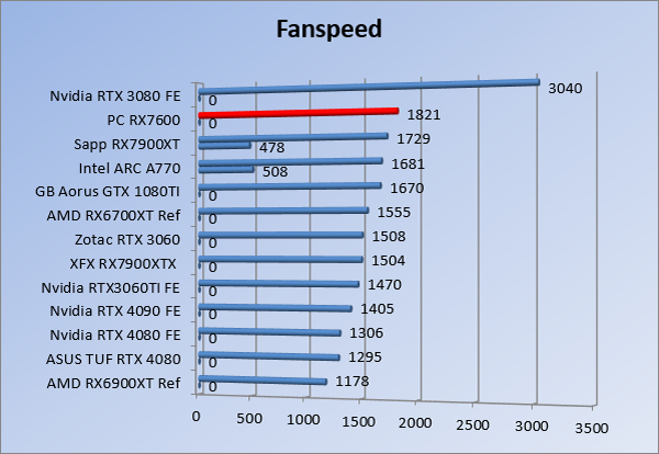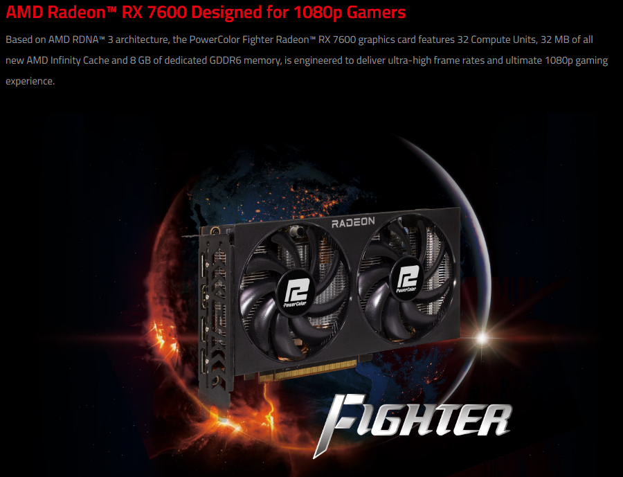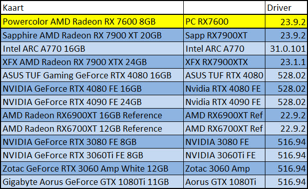 Videokaarten Powercolor Fighter AMD Radeon RX 7600 8GB review 27 maart 20241832 views0 Share By Rooieduvel Share Powercolor Fighter AMD Radeon RX 7600 8GB7.8De Powercolor AMD Radeon RX 7600 is een leuke compacte kaart om te gebruiken voor het gamen op 1080p. De geteste spellen lopen allemaal soepel en Raytracing is hier op zich ook mogelijk. 1440p komt ook nog aardig uit de verf al beginnen de prestaties iets in te storten. 4K is niet het domein van deze kaart. De kaart zelf ziet er basic uit zonder RGB maar dit hoeft geen minpunt te zijn. De kaart is vrij zuinig en vereist geen aparte connectoren dan de gewone 8-pins PCIe variant. De kaart kan overgeklokt worden maar dit gaat wel ten koste van de geluidsproductie. De temperatuur van de kaart is vrij hoog maar kan met een undervolt verholpen worden. Wel kan 8GB videogeheugen in de toekomst een probleem zijn. Al met al een leuke kaart voor een basic gaming systeem.TopVrij kleine kaart1080p prima speelbaar, 1440p vaak ook nogZuinigOverklokbaarEnkele 8-pins PCIe connector nodigFlop4K is een vaak een no-goGeen RGBIdle temperatuur is behoorlijk hoog8GB videogeheugen kan problemen geven in de toekomst Voordat ik begin met deze review: de kaart is gekocht voor een pc project van een klant. Die wilde dat de kaart getest werd voor deze ingebouwd zou worden. Besloten is er meteen een review van te maken. De klant is inmiddels blij met zijn complete pc. Half December 2022 was het dan eindelijk zo ver. Na het geweld van NVIDIA met de release van de 4000 reeks kwam AMD dan met de langverwachte opvolger van de 6000 serie namelijk de 7000 series videokaarten. Ook deze kaarten zijn gebaseerd op de RDNA architectuur die niet geheel verrassend RDNA3 heet. De opbouw van deze chips was echter anders dan wat men gewend was. Dit is namelijk het eerste ontwerp gebaseerd op chiplets, daar later meer over. De GPU’s hebben, ook zoals vorige keer, de Navi naam meegekregen. Hoe lager het nummer, hoe beter de chip. De release van de kaarten was niet zo verwarrend als de lancering van de kaarten van het groene kamp, echter worden er wel verschillende versies gebruikt onder hetzelfde nummer. Zo is er op het moment van schrijven een 7600 en 7600XT, maar hetzelfde geldt voor de 7900 reeks: daar hebben we de 7900XT en 7900XTX. Laatstgenoemde is de grotere broer van de XT kaart wat ook wel te zien is aan de opbouw van de GPU, het verbruik en de snelheden. Nu ligt over het algemeen de focus in gaming land op de high-end kaarten maar niet iedereen hoeft perse de beste kaart te hebben in zijn of haar gaming pc. Gelukkig zijn er tegenwoordig meerdere opties te krijgen die wat vriendelijker zijn voor je portemonnee. Zo ook de kaart die we hier vandaag bespreken, de Powercolor Fighter AMD Radeon RX 7600 8GB. Dit is een behoorlijke titel als je het mij vraagt. Het kaartje is niet al te groot maar de grootte hoeft niet alles te zeggen. De kaart kost op het moment van schrijven ongeveer €290,-. Maar wat ga je krijgen voor deze kaart, doet de kaart het beter dan de 6700XT van de vorige generatie en waar staat deze kaart ten opzichte van NVIDIA? Dat gaan we lezen in deze review. Architectuur Specificaties Unboxing Prestaties Synthetische benchmarks Full HD 1440P 4K resolutie Software Temperaturen en verbruik Overclocking Conclusie Voor we gaan kijken wat we voor kaart in huis hebben gaan we eerst even praten over de architectuur en de opbouw van de GPU. De GPU is gebaseerd op de RDNA architectuur wat aangekomen is bij versie 3. Dit is niets meer dan de Radeon DNA naam. De afgelopen generaties hebben we al de nodige verbeteringen gezien maar met de nieuwste versie is de GPU helemaal opnieuw opgebouwd. Zo wordt er in deze generatie gebruik gemaakt van chiplets. In plaats van één chip worden er meerdere kleinere chips geplaatst, ieder met een eigen functie. Deze zijn onderling verbonden via een hele snelle verbinding zodat er van vertraging geen sprake is. De workloads worden door de verschillende chips zeer snel afgehandeld en data snel over en weer verzonden tussen de GCD en het geheugen. Het grote voordeel hiervan is dat het goedkoper is om meerdere kleine chips te maken dan weinig grote chips. Mocht er een grote chip defect gaan dan schrijf je meer af dan wanneer er 2 kleinere chips kapot gaan. Daardoor kunnen de productiekosten wat lager blijven en dit is weer gunstig voor alle partijen. De GPU is weer opgebouwd uit verschillende CU’s oftewel Compute Units. Dit is een cluster van componenten die met elkaar samen werken. Het resultaat wordt vervolgens weer gebruikt om het beeld weer te geven. AMD laat niet echt zien hoe een CU opgebouwd is terwijl we dit wel kunnen zien bij het groene kamp. Men claimt met de nieuwe generatie in ieder geval forse winsten in AI en Raytracing, iets waar AMD toch wat op achter loopt dan NVIDIA. Met RDNA3 introduceert AMD een nieuwe Display Engine genaamd Radiance Display Engine. Men heeft een Displaypoort 2.1 aansluiting op de kaart gemonteerd die maar liefst 54Gb/s aan bandbreedte kan leveren. Dit moet zorgen voor refresh rates van 165 Hz op 8K of 480 Hz op 4K zodat de kaart klaar is voor de toekomst. Ook is er ondersteuning voor 12-bit HDR content, wat moet zorgen voor een spetterend beeld. Voor content creators brengt de nieuwste generatie RDNA AV1 encoding en decoding. Een videokaart kan gebruikt worden voor het maken en verwerken van content zoals video’s en internet streams. AMD heeft met RDNA3 een gigantische sprong gemaakt om op een goedkope manier content te presenteren. Andere kaarten konden dit al maar AMD heeft hier hele grote sprongen mee gemaakt en doet nu mee met de rest van het speelveld. Meer info is terug te vinden op de pagina van AMD. Terug naar boven Voor we de kaart zelf gaan bekijken pakken we eerst de theorie er eens bij. Zoals we net al zagen is de RX 7600 geen grote kaart maar dat is ook niet altijd nodig. De kaart is maar 20 centimeter lang, 11 centimeter breed en 4 centimeter hoog. Met het bracket is de kaart ietsj