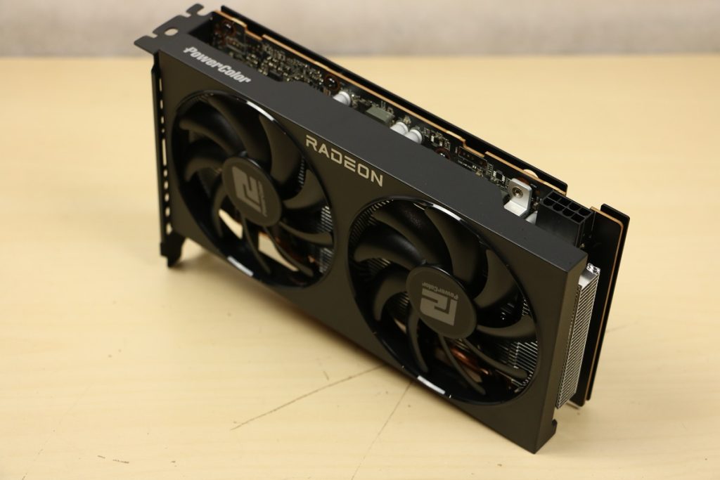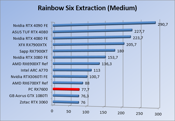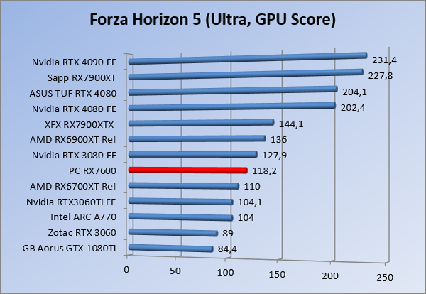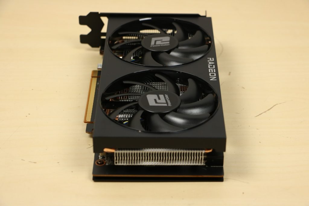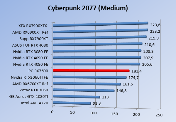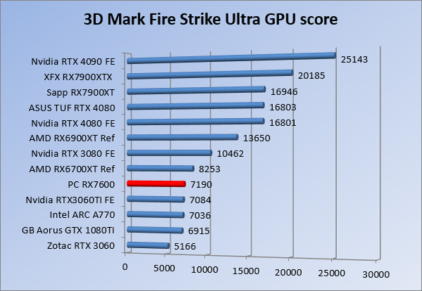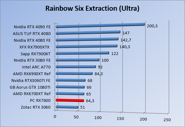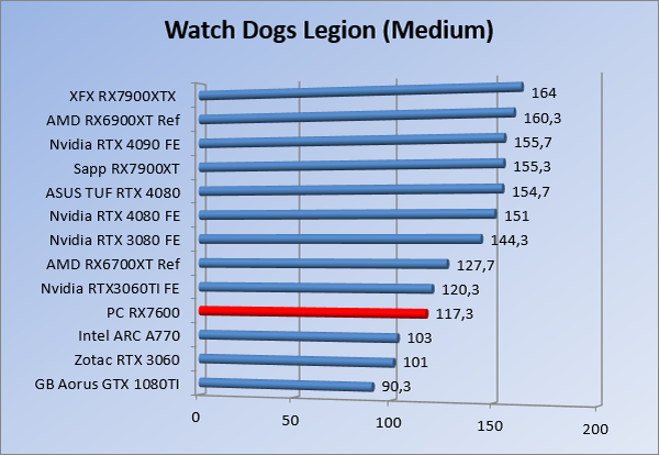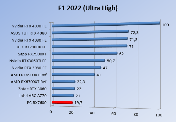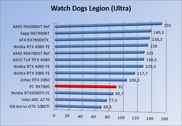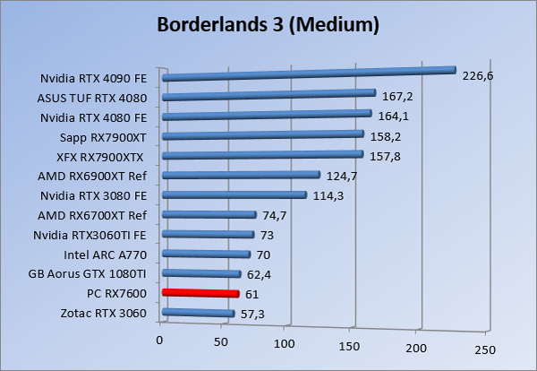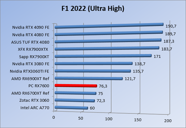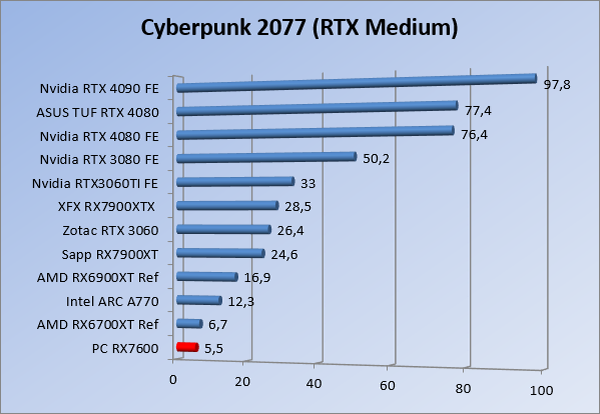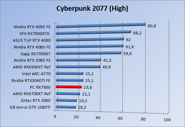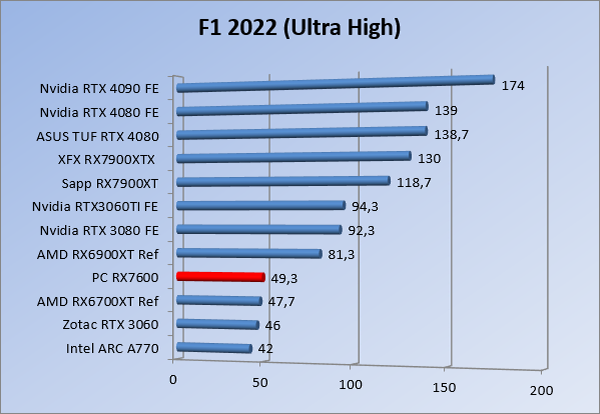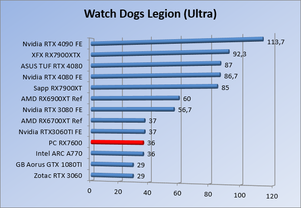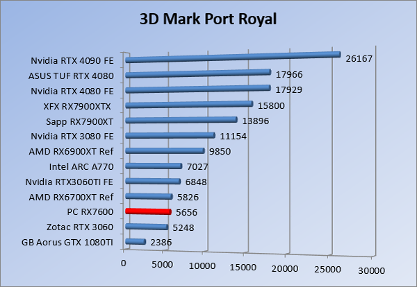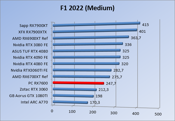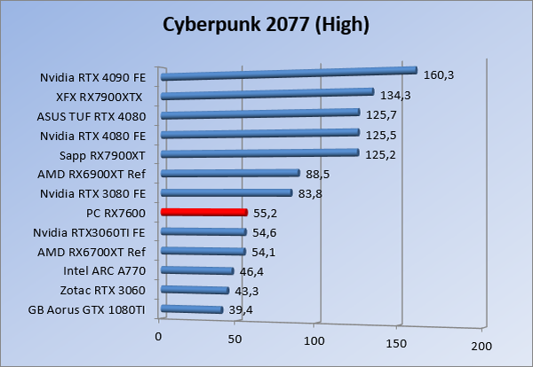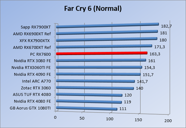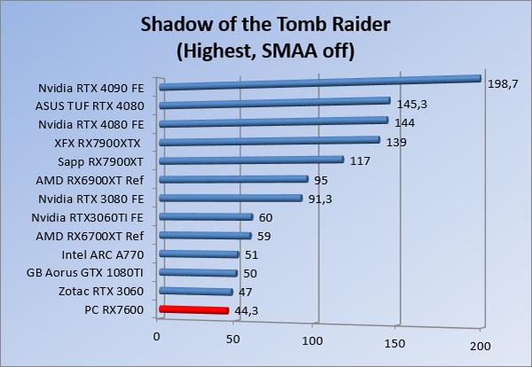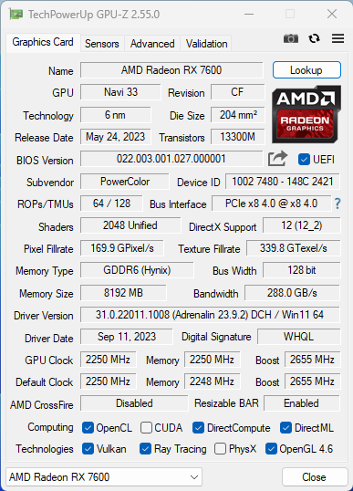 Videokaarten Powercolor Fighter AMD Radeon RX 7600 8GB review 27 maart 20241832 views0 Share By Rooieduvel Share Powercolor Fighter AMD Radeon RX 7600 8GB7.8De Powercolor AMD Radeon RX 7600 is een leuke compacte kaart om te gebruiken voor het gamen op 1080p. De geteste spellen lopen allemaal soepel en Raytracing is hier op zich ook mogelijk. 1440p komt ook nog aardig uit de verf al beginnen de prestaties iets in te storten. 4K is niet het domein van deze kaart. De kaart zelf ziet er basic uit zonder RGB maar dit hoeft geen minpunt te zijn. De kaart is vrij zuinig en vereist geen aparte connectoren dan de gewone 8-pins PCIe variant. De kaart kan overgeklokt worden maar dit gaat wel ten koste van de geluidsproductie. De temperatuur van de kaart is vrij hoog maar kan met een undervolt verholpen worden. Wel kan 8GB videogeheugen in de toekomst een probleem zijn. Al met al een leuke kaart voor een basic gaming systeem.TopVrij kleine kaart1080p prima speelbaar, 1440p vaak ook nogZuinigOverklokbaarEnkele 8-pins PCIe connector nodigFlop4K is een vaak een no-goGeen RGBIdle temperatuur is behoorlijk hoog8GB videogeheugen kan problemen geven in de toekomst Voordat ik begin met deze review: de kaart is gekocht voor een pc project van een klant. Die wilde dat de kaart getest werd voor deze ingebouwd zou worden. Besloten is er meteen een review van te maken. De klant is inmiddels blij met zijn complete pc. Half December 2022 was het dan eindelijk zo ver. Na het geweld van NVIDIA met de release van de 4000 reeks kwam AMD dan met de langverwachte opvolger van de 6000 serie namelijk de 7000 series videokaarten. Ook deze kaarten zijn gebaseerd op de RDNA architectuur die niet geheel verrassend RDNA3 heet. De opbouw van deze chips was echter anders dan wat men gewend was. Dit is namelijk het eerste ontwerp gebaseerd op chiplets, daar later meer over. De GPU’s hebben, ook zoals vorige keer, de Navi naam meegekregen. Hoe lager het nummer, hoe beter de chip. De release van de kaarten was niet zo verwarrend als de lancering van de kaarten van het groene kamp, echter worden er wel verschillende versies gebruikt onder hetzelfde nummer. Zo is er op het moment van schrijven een 7600 en 7600XT, maar hetzelfde geldt voor de 7900 reeks: daar hebben we de 7900XT en 7900XTX. Laatstgenoemde is de grotere broer van de XT kaart wat ook wel te zien is aan de opbouw van de GPU, het verbruik en de snelheden. Nu ligt over het algemeen de focus in gaming land op de high-end kaarten maar niet iedereen hoeft perse de beste kaart te hebben in zijn of haar gaming pc. Gelukkig zijn er tegenwoordig meerdere opties te krijgen die wat vriendelijker zijn voor je portemonnee. Zo ook de kaart die we hier vandaag bespreken, de Powercolor Fighter AMD Radeon RX 7600 8GB. Dit is een behoorlijke titel als je het mij vraagt. Het kaartje is niet al te groot maar de grootte hoeft niet alles te zeggen. De kaart kost op het moment van schrijven ongeveer €290,-. Maar wat ga je krijgen voor deze kaart, doet de kaart het beter dan de 6700XT van de vorige generatie en waar staat deze kaart ten opzichte van NVIDIA? Dat gaan we lezen in deze review. Architectuur Specificaties Unboxing Prestaties Synthetische benchmarks Full HD 1440P 4K resolutie Software Temperaturen en verbruik Overclocking Conclusie Voor we gaan kijken wat we voor kaart in huis hebben gaan we eerst even praten over de architectuur en de opbouw van de GPU. De GPU is gebaseerd op de RDNA architectuur wat aangekomen is bij versie 3. Dit is niets meer dan de Radeon DNA naam. De afgelopen generaties hebben we al de nodige verbeteringen gezien maar met de nieuwste versie is de GPU helemaal opnieuw opgebouwd. Zo wordt er in deze generatie gebruik gemaakt van chiplets. In plaats van één chip worden er meerdere kleinere chips geplaatst, ieder met een eigen functie. Deze zijn onderling verbonden via een hele snelle verbinding zodat er van vertraging geen sprake is. De workloads worden door de verschillende chips zeer snel afgehandeld en data snel over en weer verzonden tussen de GCD en het geheugen. Het grote voordeel hiervan is dat het goedkoper is om meerdere kleine chips te maken dan weinig grote chips. Mocht er een grote chip defect gaan dan schrijf je meer af dan wanneer er 2 kleinere chips kapot gaan. Daardoor kunnen de productiekosten wat lager blijven en dit is weer gunstig voor alle partijen. De GPU is weer opgebouwd uit verschillende CU’s oftewel Compute Units. Dit is een cluster van componenten die met elkaar samen werken. Het resultaat wordt vervolgens weer gebruikt om het beeld weer te geven. AMD laat niet echt zien hoe een CU opgebouwd is terwijl we dit wel kunnen zien bij het groene kamp. Men claimt met de nieuwe generatie in ieder geval forse winsten in AI en Raytracing, iets waar AMD toch wat op achter loopt dan NVIDIA. Met RDNA3 introduceert AMD een nieuwe Display Engine genaamd Radiance Display Engine. Men heeft een Displaypoort 2.1 aansluiting op de kaart gemonteerd die maar liefst 54Gb/s aan bandbreedte kan leveren. Dit moet zorgen voor refresh rates van 165 Hz op 8K of 480 Hz op 4K zodat de kaart klaar is voor de toekomst. Ook is er ondersteuning voor 12-bit HDR content, wat moet zorgen voor een spetterend beeld. Voor content creators brengt de nieuwste generatie RDNA AV1 encoding en decoding. Een videokaart kan gebruikt worden voor het maken en verwerken van content zoals video’s en internet streams. AMD heeft met RDNA3 een gigantische sprong gemaakt om op een goedkope manier content te presenteren. Andere kaarten konden dit al maar AMD heeft hier hele grote sprongen mee gemaakt en doet nu mee met de rest van het speelveld. Meer info is terug te vinden op de pagina van AMD. Terug naar boven Voor we de kaart zelf gaan bekijken pakken we eerst de theorie er eens bij. Zoals we net al zagen is de RX 7600 geen grote kaart maar dat is ook niet altijd nodig. De kaart is maar 20 centimeter lang, 11 centimeter breed en 4 centimeter hoog. Met het bracket is de kaart ietsj