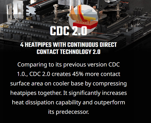 Aangezien het de opvolger en de verbeterde versie is van de MasterAir Pro 4 verwacht je dat er de nodige verbeteringen gedaan zijn aan de koeler en dat klopt aardig. Zo is de koeler voorzien van vier heatpipes die gebruik maken van CDC 2.0, wat Continuous Direct Contact betekent. Dit houdt in dat er een groter koeloppervlak aanwezig is wat moet zorgen dat de warmte veel beter afgevoerd wordt van de processor. Uiteraard zegt deze techniek niet alles en moet de rest van de koeler ook geoptimaliseerd zijn.