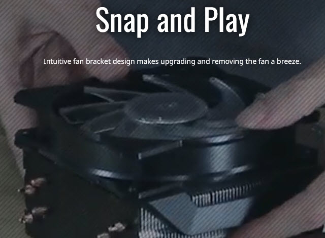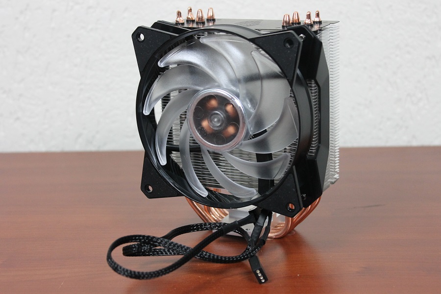 De ventilator die al op de koeler zit is een 120mm Masterfan ventilator waar twee brackets op geschroefd zitten. Zo kan de ventilator makkelijk verwijderd worden of juist weer terug geplaatst (wat ook nodig is voor de installatie). Cooler Master levert nog een set clips mee waarmee een extra ventilator op de koeltoren geklikt kan worden zodat er nog meer airflow is. De ventilator is voorzien van twee aansluitingen: de eerste is om de ventilator aan te sturen, de tweede is om de verlichting van de ventilator aan te sturen. Deze kan aangesloten worden op de meegeleverde RGB controller of op de connector van het moederbord.