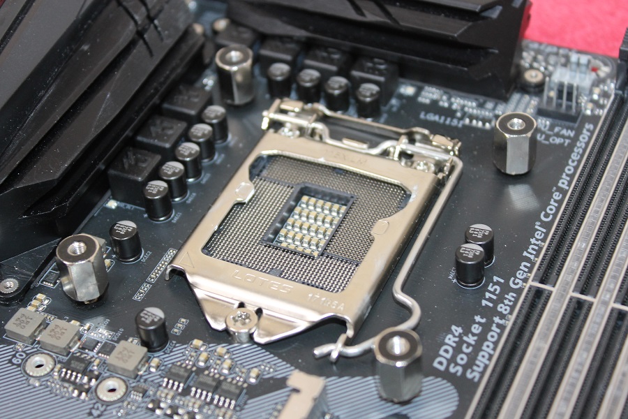Mocht je willen kijken of alles past of welke stand gebruikt moet worden voor de koeler dan is het mogelijk om alvast de “spinnenpoot” vast te zetten op de eerder gemonteerde moeren. Mocht het nodig zijn dan kan een en ander nog aangepast worden. Haal alles weer los als je weet welke stand gebruikt moet worden. Doe nu wat koelpasta op de processor om eventuele oneffenheden op te vullen. Steek het bracket tussen de heatpipes door zodat deze uiteindelijk het blok vast kan zetten op de processor. Let er wel op dat deze in het midden een pin heeft die precies in de koeler valt. Pak het geheel op en plaats dit op het bord. Bevestig het bracket aan het bord door de vier schroeven vast te zetten. Doe dit wel in kruisvorm zodat de koeler netjes vastgezet wordt. Mocht er toch iets niet passen dan is het mogelijk de schroeven op een iets andere plek te plaatsen. Als alles vast zit zien we de toren netjes op het bord zitten.