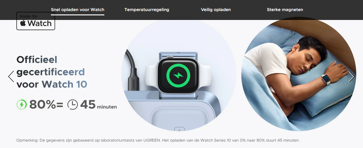 De 3-in-1 lader is ook gecertificeerd voor de Apple Watch 10. Dit betekent dat je Apple Watch snel opgeladen kan worden zodat hij meteen weer te gebruiken is. Als je je horloge op de lader legt dan is hij in 45 minuten weer voor 80% geladen. Dit is lekker snel en zo kun je weer snel je notificaties lezen en je gezondheid in de gaten houden. Uiteraard is het ook mogelijk de lader te gebruiken die bij de horloge geleverd wordt maar dat betekent dat je toch een extra lader mee moet nemen, iets wat je niet wilt.