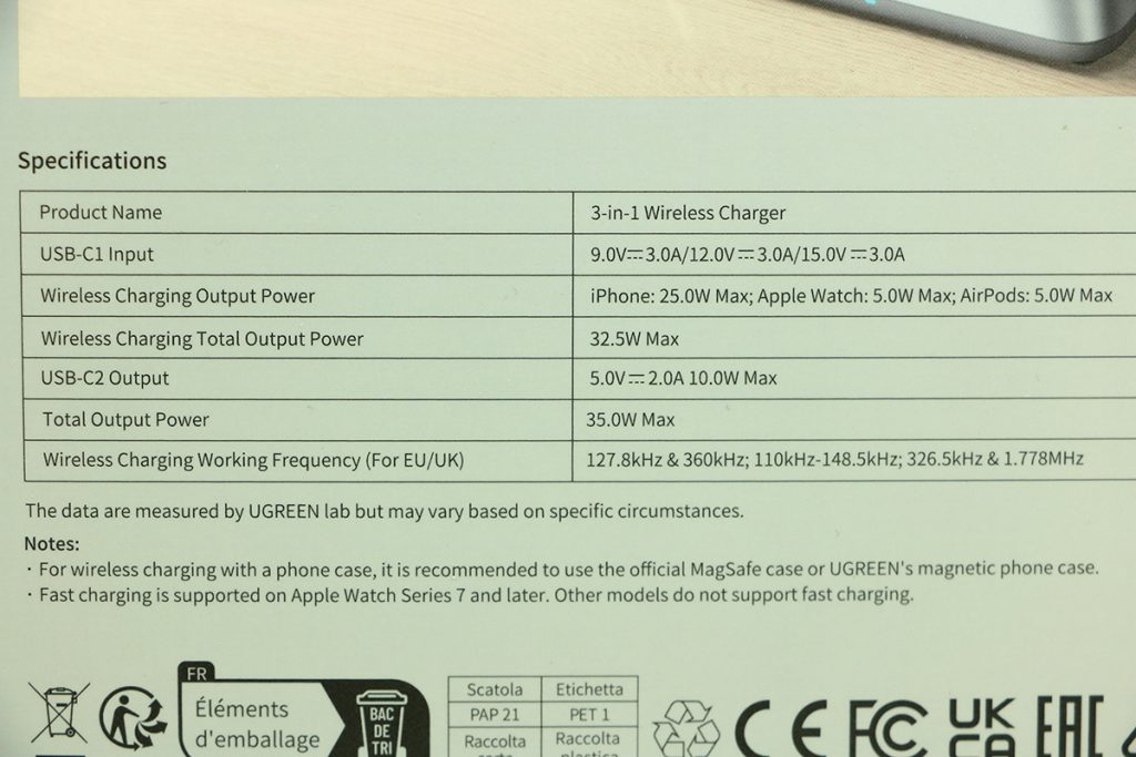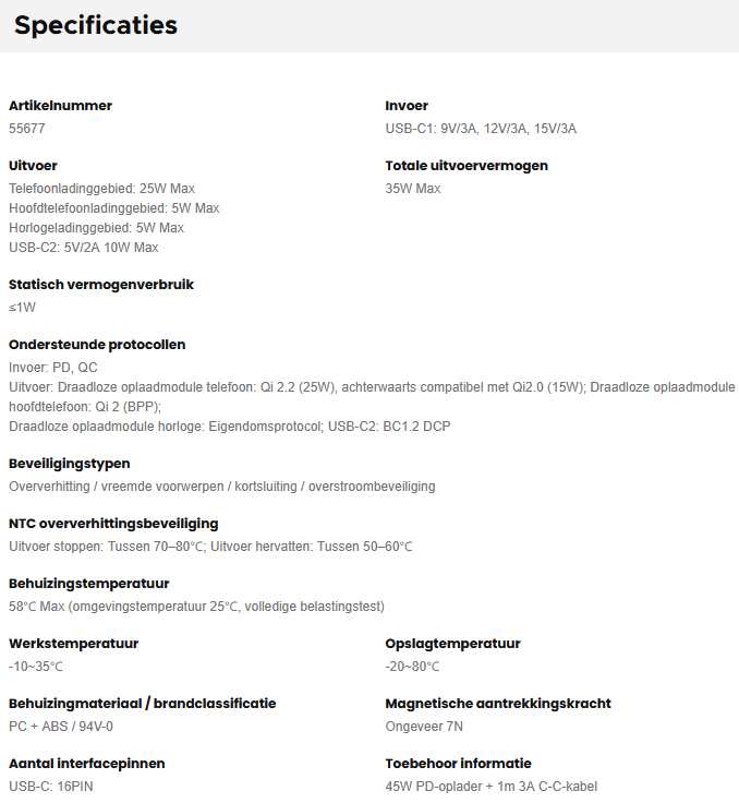 De lijst met informatie is op zich niet zo groot maar dat hoeft uiteraard ook niet voor een lader. We zien dat de invoer voor de lader altijd 3 Ampère is en dat het niet uitmaakt wat het voltage is. De draadloze uitvoer is voor de telefoon maximaal 25 Watt, voor de oortjes maximaal 5 Watt en voor het horloge ook maximaal 5 Watt. De tweede USB aansluiting op de lader kan maximaal 5 Volt met 2 Ampère leveren wat een totaal geeft van 10 Watt maximaal. Wel is de maximale output 35 Watt in totaal dus het is niet mogelijk vier apparaten met het maximale wattage op te laden. Het fijne is dat er bij deze lader wel een stroomadapter geleverd wordt in tegenstelling tot de 2-in-1 lader van UGREEN. Een kabel mag uiteraard niet ontbreken. De lader ondersteunt Power Delivery en Quick Charge. Het laden stopt bij temperaturen rond de 70 graden wat de lader ziet als oververhitting. Ook wordt er rekening gehouden met kortsluiting en spanningspieken.