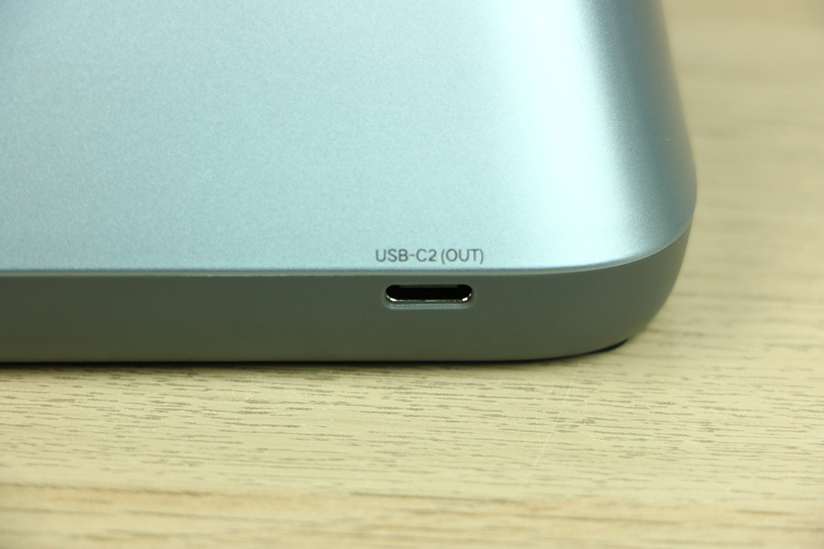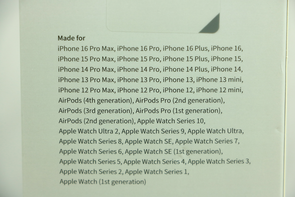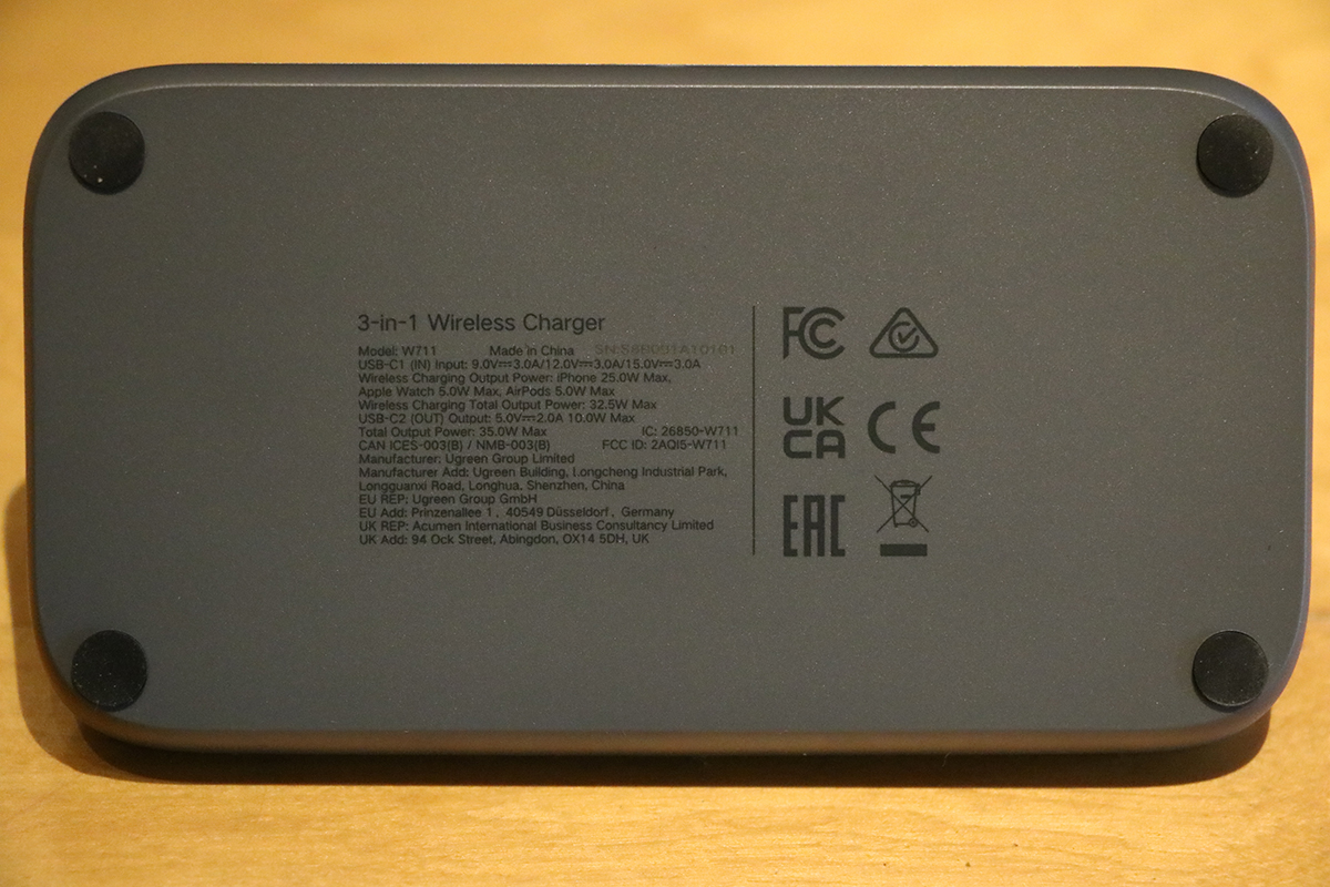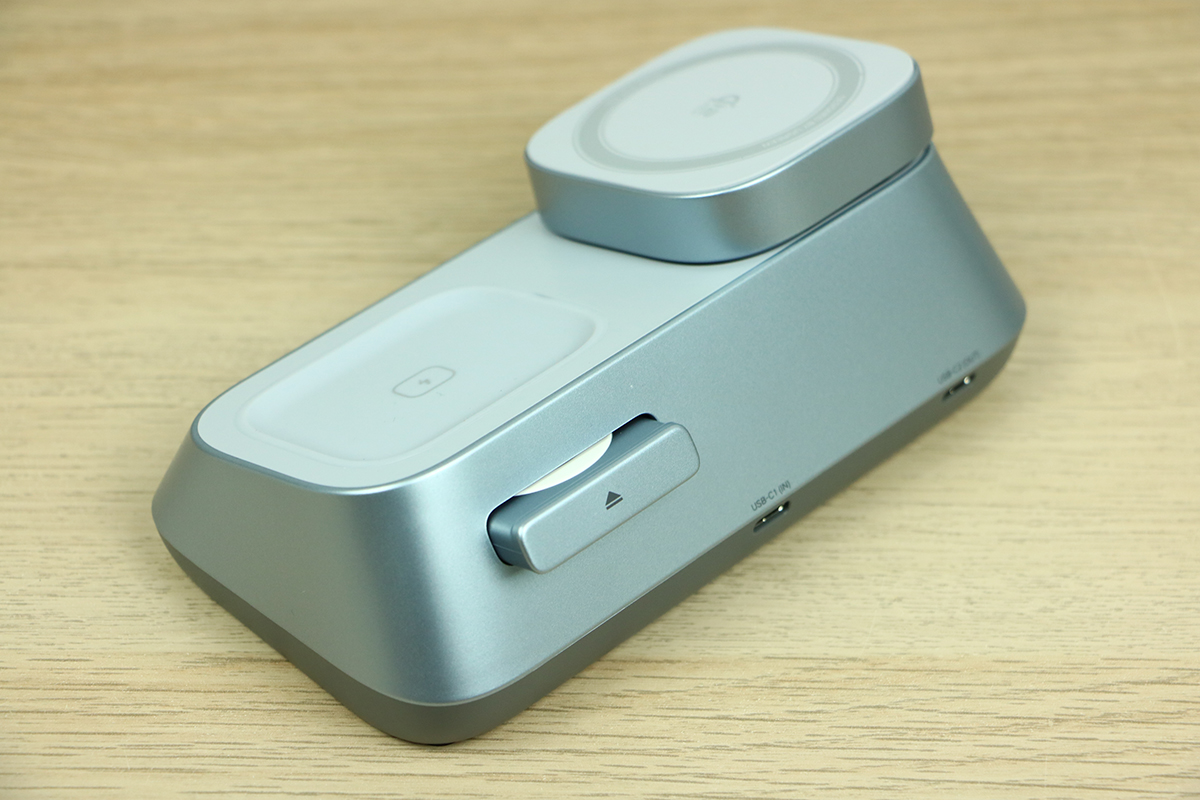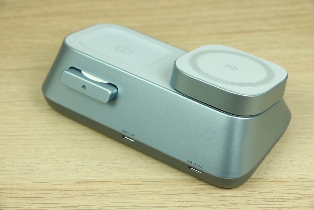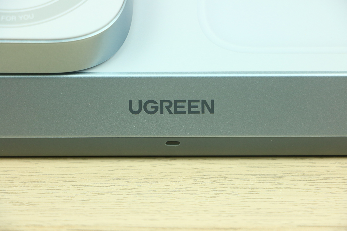Helemaal links hebben we het laadgedeelte voor de telefoon. Dat is een vierkant plaatje met in het midden de Qi2 certificering en een ronde rand. Deze rand bevat de magneten waar het toestel mee vastgezet wordt op de lader. Rechts daarvan hebben we het gedeelte waar de AirPods opgeladen kunnen worden. De vorm van het doosje is hier aangehouden waardoor hij goed blijft liggen. Aan de achterkant hebben we de USB-C aansluiting waar de USB kabel van de adapter ingaat zodat de apparaten ook daadwerkelijk kunnen laden. Rechts daarvan hebben we een USB-C aansluiting waar een ander apparaat mee opgeladen kan worden. Houd er wel rekening mee dat via deze poort maar met maximaal 10 Watt opgeladen kan worden. Mocht je hier een extra telefoon mee willen laden dan zal het langer duren eer deze vol is.