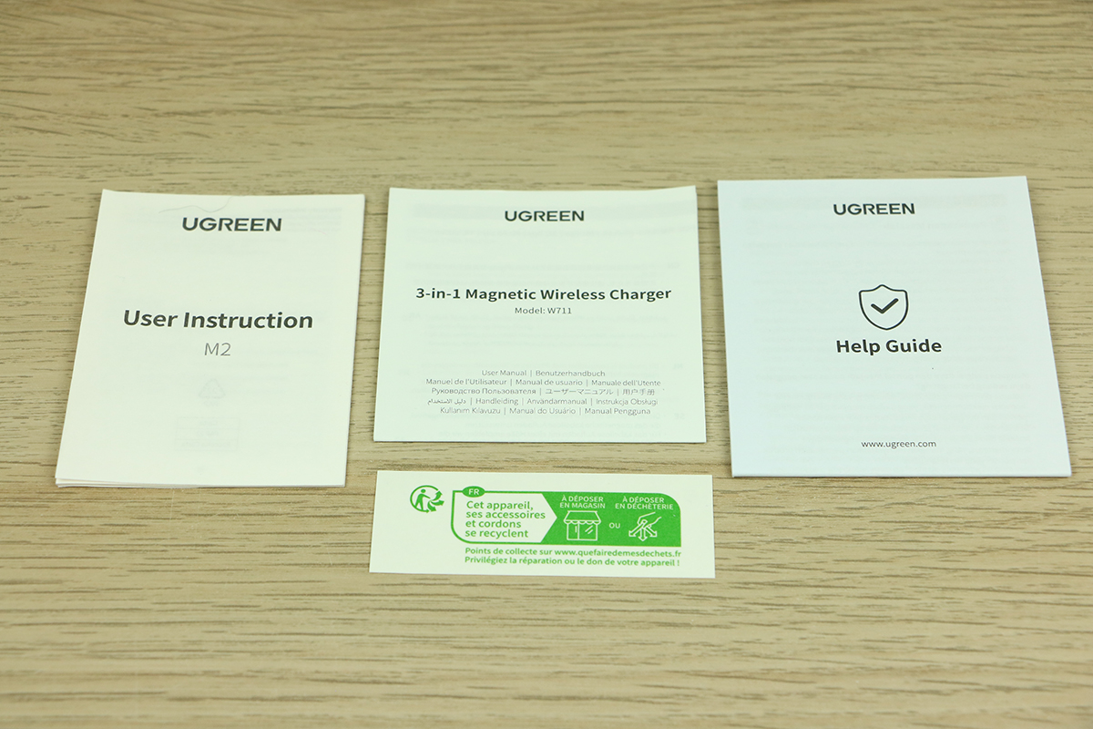 Als we het deksel openslaan dan zien we de lader liggen en een wit doosje. Deze is uit de grote doos te tillen door hem aan het lipje omhoog te trekken. Hier vinden we de accessoires die UGREEN bij de lader levert. Een beetje verrassend is het feit dat men een adapter meelevert. Dit is niet standaard meer het geval tegenwoordig en moet je zelf voor een lader zorgen. Dit is wel een pluspunt. Uiteraard mag een USB-C kabel niet ontbreken om de lader aan te sluiten op de adapter. Zo kunnen de apparaten opgeladen worden. Natuurlijk mag het nodige papierwerk niet ontbreken. We zien een User Instruction, een User Manual en een Help Guide. Als laatste is er een klein papiertje hoe de geheel gerecycled moet worden. Dit is overigens wel in het Frans. Pakkn we de lader erbij dan zien we dat deze mooi ingepakt zit in plastic.