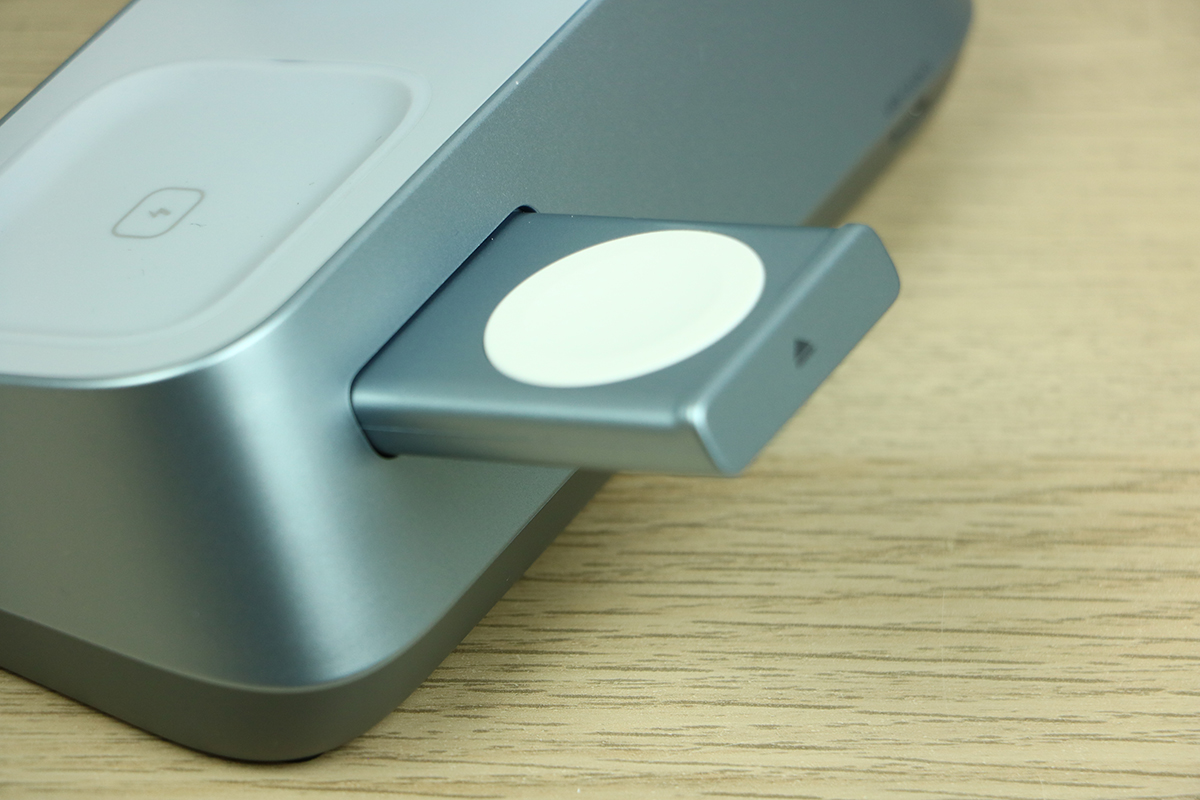 Aan de voorkant van de lader zien we het merk terug samen met een LED lampje. Dit lampje heeft maar één kleur en zal branden wanneer er ook maar één ding aan het laden is. Hij laadt dus of wel of helemaal niet. Aan de achterkant hebben we nog iets verborgen zitten. Dit is het laadgedeelte voor je Apple Watch. Deze kun je tevoorschijn laten komen door dit gedeelte in te drukken. Daarna schuift het plaatje uit. Dit is een mooi rustpunt voor je horloge. Als alles uitgeklapt is ziet de lader er iets indrukwekkender uit. We zien ook dat het telefoongedeelte kan kantelen net zoals we zagen bij de eerder geteste 2-in-1 lader. Zo kun je doorgaan met een film kijken of je spelletje terwijl het toestel oplaadt. Op de onderkant zien we vier rubber voetjes die de lader op zijn plek moeten houden. Daar zien we ook de specificaties staan van de lader samen met de naam en het modelnummer.