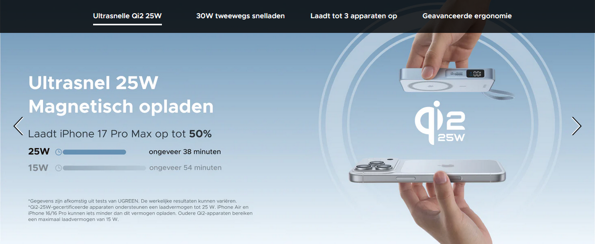 MobileUgreen MagFlow Magnetische Draadloze Powerbank review 28 januari 20261 view0Share By Rooieduvel ShareUgreen MagFlow Magnetische Draadloze Powerbank9.2De UGREEN MagFlow Wireless powerbank is een handige lader voor op reis of voor die beursbezoeken. Deze lader wordt als het ware onderdeel van je telefoon en laadt deze draadloos op. Hoe snel is afhankelijk van je toestel: 15 of 25 Watt. Uiteraard is het ook mogelijk andere toestellen te laden die MagSafe ondersteunen. Mocht je toestel dat niet hebben dan kun je altijd nog draadloos laden of gebruik maken van de ingebouwde kabel wat best praktisch is. De extra USB poort zorgt ervoor dat je ook je horloge of een ander apparaat kunt laden. Het is tevens mogelijk je powerbank en toestel tegelijk op te laden. Let wel op het gebruik in combinatie met een hoesje, het kan zijn dat de powerbank niet goed hecht. Een prima apparaat met een vrij pittig prijskaartje.TopIngebouwde kabel Dankzij Qi2 wordt de powerbank één geheel met je toestel Bedraad laden gaat aardig snel, ook op een Android device Apparaat opladen mogelijk terwijl je de powerbank laadt Wordt niet enorm warm FlopBlijft niet goed zitten bij een iPhone met een hoesje Laadt wat trager als je geen Qi2 compatible apparaat hebt Premium prijskaartje door Qi2 Een apparaat zonder MagSafe reageert amper op de magneten. Voordat ik begin aan deze review wil ik UGREEN bedanken voor het beschikbaar stellen van deze Qi2 powerbank. Deze zal voornamelijk gebruikt gaan worden door mijn vriendin als we op stap zijn.UGREEN is een bedrijf wat voornamelijk bekend staat om powerbanks, laders, kabels en docks. En geef toe: laders en powerbanks kun je eigenlijk nooit genoeg hebben. Telefoons worden steeds vaker gebruikt en gaan daardoor steeds sneller leeg. Je zou kunnen zeggen dat batterijen steeds beter zouden moeten worden en dat worden ze langzamerhand wel maar aangezien toestellen ook groter worden blijft de accuduur meestal gelijk. Gelukkig staat de techniek van het laden ook niet stil en worden er steeds nieuwe snufjes en features verzonnen.Een hot topic op IFA 2024 was Qi2, de nieuwe standaard voor draadloos laden. Enorm veel stands hadden hier aandacht voor en elk bedrijf had nieuwe producten te tonen met deze standaard. De key features op dat moment waren dat de magneten er beter voor moesten zorgen dat de telefoon op zijn plek blijft, het laden efficiënter gaat, betere koeling en laders die meer dan één apparaat kunnen laden. Destijds werd een snellere laadsnelheid geïntroduceerd van 15 Watt met de mogelijkheid om naar 25 Watt te gaan. Inmiddels zijn we een jaar verder en zijn er meer en meer producten waarmee 25 Watt draadloos geladen kan worden.UGREEN heeft een Magsafe lijn genaamd MagFlow waarin verschillende producten te vinden zijn. Hier vinden we ook de nieuwe generatie die Qi2 en 25 Watt draadloos laden ondersteunt. We hebben in deze nieuwe reeks een powerbank, een 2-in-1 lader en een 3-in-1 lader. In deze review behandelen we de draadloze powerbank die via Magsafe aan je telefoon geplakt blijft. Uiteraard zijn er al heel veel powerbanks maar deze moet je telefoon nog sneller opladen. Deze powerbank is te koop voor een prijs van €89,99 maar er loopt een kortingsactie op hun internetpagina. Maar wat vinden we van deze Powerbank? We gaan erachter komen in deze wat kortere review (dan jullie gewend zijn).SpecificatiesUnboxingErvaringConclusieVoordat we de powerbank gaan uitpakken gaan we eerst eens wat theorie behandelen.We hebben hier geen enorm grote lijst maar dat hoeft ook niet zo zeer. We vinden alle informatie die we nodig hebben en wat deze powerbank allemaal te leveren heeft. We zien in ieder geval dat de input altijd 3 Ampere is, ongeacht het voltage wat er geleverd wordt. Wel is er een maximum van 30 Watt ingesteld. Via de kabel zijn er verschillende voltages en Ampères mogelijk zolang het maximum maar ligt op dezelfde 30 Watt. Aangezien de lader gemaakt is voor Qi2 is laden op die manier mogelijk met een wattage van 25 Watt. Uiteraard zijn er de verschillende protocollen zoals Power Delivery, Quick Charge etc. De afmetingen zijn 11,1 bij 7 bij 2,1 centimeter wat niet echt groot is. Het gewicht ligt op 254 gram en dat is op zich ook niet veel maar ook niet prettig om de hele tijd los in je handen te hebben. De totale capaciteit van de powerbank ligt op 10.000 mAh. Er is een piekspanningsbeveiliging aanwezig op de lader wat alleen maar prettig is. De efficiëntie ligt tussen de 70 en 90%, afhankelijk hoe je aan het laden bent.Zoals we net al aangaven gaat het draadloos laden via Qi2 met een snelheid van 25 Watt. Dat is de verbeterde manier van opladen zodat je iPhone lekker snel weer te gebruiken is. in 38 minuten is je telefoon weer voor 50% vol. Bovendien is de lader voorzien van Magsafe waardoor de powerbank zich als het ware vast zuigt aan je telefoon. Daardoor worden je telefoon en lader één geheel en hoef je niet alles los te dragen. Wel wordt je telefoon op die manier ietsjes zwaarder. Let wel op dat een hoesje ervoor kan zorgen dat je telefoon iets minder makkelijk verbinding maakt met de powerbank.Een handigheidje van de powerbank: het “bandje” waar je de lader aan vasthoudt is eigenlijk een ingebouwde USB-C kabel Zo hoef je dus geen aparte kabel mee te nemen om je telefoon op te laden. Deze zit netjes verstopt aan de zijkant van de powerbank en is meteen te gebruiken. Het is een kwestie van de connector los te halen uit de zijkant en uittrekken zodat je je apparaat ook bekabeld kunt opladen. Heel erg handig voor het laden van je oortjes of een apparaat wat niet draadloos kan laden.Doordat de powerbank achter je telefoon kan blijven hangen kun je je telefoon de hele tijd door gebruiken zonder dat je bang hoeft te zijn dat deze leeg begint te raken. Je kunt dus lekker doorgaan met het kijken van je video, het maken van video’s of foto’s of bezig blijven met je spelletje. Het laadproces gaat gewoon door en je merkt er eigenlijk niet zoveel van buiten het g