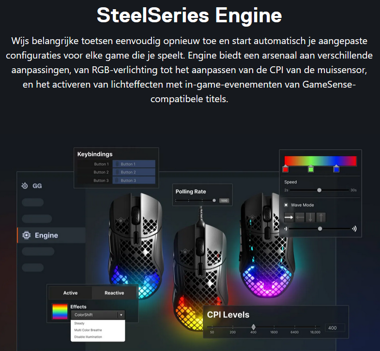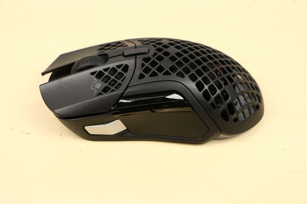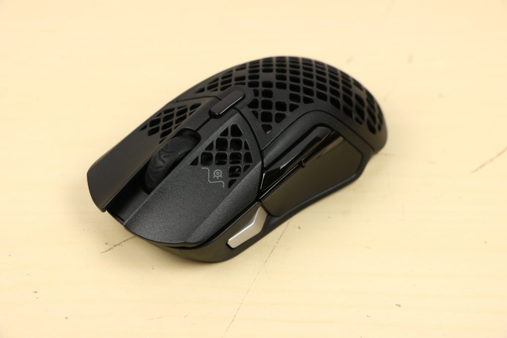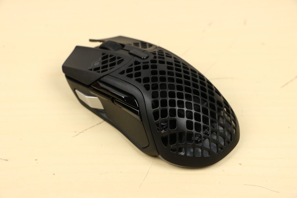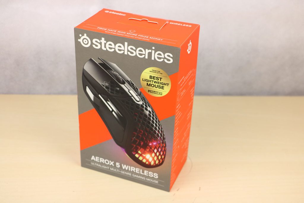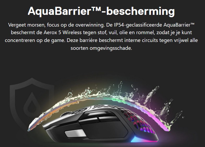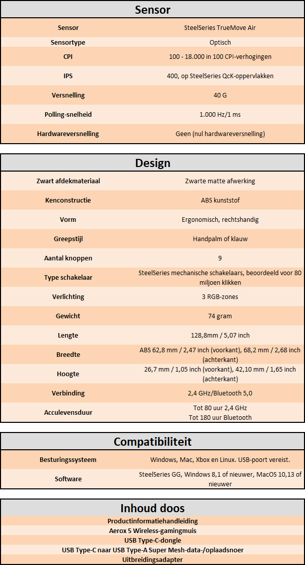 MuizenSteelseries Aerox 5 Wireless review Muis met gaten 16 april 2025695 views2Share By Rooieduvel ShareSteelseries Aerox 5 Wireless7.5De Steelseries Aerox 5 Wireless is een echte gamersmuis met een ribcage ontwerp. Het gebruik is even wennen maar dit zorgt er wel voor dat de muis erg licht is. De muis is prettig in het gebruik en kan zowel met dongel als via Bluetooth gebruikt worden. De dongel zorgt er wel voor dat de accu sneller leeg is maar de muis laadt erg snel op. De Truemove sensor doet prima zijn werk en is erg nauwkeurig. De knoppen voelen prima aan en zijn naar wens in te stellen. Uiteraard mag RGB niet ontbreken al is dit beter aan de onderkant te zien dan door de muis heen. Een prima muis als je op zoek bent naar een lichtgewicht exemplaar, al moet je er best wat voor neertellen.TopLichtgewichtRGB ziet er goed uitAccu gaat lang meeZowel bedraad als draadloos te gebruikenSymmetrisch dus ook linkshandig te gebruikenSnel opgeladenFlopKan wat prijzig zijn voor sommige mensen Had wellicht iets meer verlichting door de muis heen mogen schijnen Extra knop boven overige knoppen is fijn maar erg wennen De gekozen DPI instelling is niet duidelijk te zienBij deze wil ik Steelseries bedanken voor het beschikbaar stellen van deze Aerox 5 Wireless muis.Steelseries is alweer een tijdje actief op de markt van gaming apparatuur. Het Deense bedrijf timmert flink aan de weg met verschillende soorten hardware die over het algemeen kwalitatief goed in elkaar steken. Qua muizen zijn er al meerdere series op de markt uitgebracht zoals de Sensei, Kinzu en Rival muizen. De laatste serie muizen heeft de naam Aerox meegekregen. Tevens brengt het bedrijf verschillende toetsenborden uit in de Apex serie in verschillende prijsklassen en formaten zodat er voor ieder wat wils is. Voor muismatten geldt hetzelfde: er zijn kleine muismatten van €10, maar ook matten die meer dan €50 moeten kosten.Het bedrijf heeft ook meerdere headsets in het assortiment. Zo heb ik zelf nog een SteelSeries Siberia V2 Headset – MSI Gaming Edition gehad die ik ooit gewonnen heb. De laatste generatie headsets komen uit de Arctis serie die zowel bedraad als draadloos te krijgen zijn. Daarnaast zijn ze aardig aan de weg aan het timmeren met onder andere speakers, controllers en zelfs microfoons, allemaal met een eigen prijskaartje zodat er voor ieder wat wils te krijgen is.Het artikel van vandaag is de Steelseries Aerox 5 Wireless, een lichtgewicht draadloze muis die waterdicht is, megasnel zou moeten zijn en voorzien is van RGB verlichting (wat niemand zal verbazen). De muis is te krijgen voor ongeveer €100,- op het moment van schrijven. Wat je ervoor krijgt? Lees vooral verder!SpecificatiesUnboxingSoftwareErvaringConclusieWe kijken eerst naar de specificaties van dit apparaat.We zien dat Steelseries zijn eigen sensor gebruikt namelijk de TrueMove Air sensor. Dit llijkt een aangepaste versie te zijn van de Pixart 3335 sensor. Deze sensor wordt breed gebruikt in de gaming wereld dus het is niet zo gek dat Steelseries de keuze heeft gemaakt om deze sensor aan te passen en in deze muis te monteren. Het gaat hier wel om een optische sensor dus geen laser. Het maximale CPI is maar liefst 18.000 maar dat is een waarde die je zelf nooit zult gebruiken. De muis wordt daarbij heel onnauwkeurig en gaat veel te snel over je scherm heen. De muis weegt maar 74 gram en heeft een maximale afmeting van 68.2 bij 42.1 millimeter, een beetje een standaard grootte. Er kan gebruikt gemaakt worden van een Bluetooth verbinding of de dongel die Steelseries bij de muis levert. Bekabeld is ook mogelijk maar daarvoor neem je geen draadloze muis. De accuduur is maximaal 180 uur als je gebruik maakt van Bluetooth maar dit zakt naar 80 uur als je gebruik maakt van de dongel.Het meest aparte van de muis is dat het voorzien is van een honingraat structuur. Dit zorgt ervoor dat het gewicht van de muis afneemt waardoor het prettiger in gebruik zou moeten zijn. Door de constructie blijft de behuizing toch heel bij al het gaming geweld. Het gewicht wordt nog minder omdat men de accu aangepast heeft. Deze is nu maar 6 gram wat volgens Steelseries een stuk lichter zou moeten zijn dan van de concurrenten. Dit doet men wel zonder in te leveren op prestaties aangezien de accuduur nog steeds maximaal 180 uur is. Ook is het PCB een stuk dunner wat ook weer bespaart op het gewicht.De muis heeft ook een IP rating meegekregen. Wel zo handig aangezien de muis een open structuur heeft. Het lijkt best eng om een muis te gebruiken die zo open is maar er is een coating aangebracht die moet beschermen tegen vuil en stof. Je hoeft je dus geen zorgen te maken als je loopt te knoeien over je muis of dat er allemaal stof binnen in de muis komt. De printplaat is hier tegen beschermd en jij kunt je gewoon bezig houden met jouw activiteit.Uiteraard heeft Steelseries zijn eigen software pakket en dit is de Steelseries Engine. Men maakt hier al langer gebruik van en ook deze muis wordt ondersteunt. Met dit pakket zijn knoppen en kleuren aan te passen. Ook is het mogelijk hiermee updates te downloaden en te installeren die eventuele problemen kunnen verhelpen. Tevens is het mogelijk de gevoeligheid van de muis aan te passen. Een leuke bijkomstigheid is dat sommige spellen kunnen samenwerken met de software van Steelseries waardoor in spellen een bepaald kleureneffect gestart wordt. Denk aan bijvoorbeeld het planten van de bom in Counter Strike. De muis begint dan te knipperen op het tikken van de bom. Een grappige toevoeging. Tevens worden instellingen automatisch toegepast op dat spel.Wil je meer lezen over deze muis op de pagina van Steelseries dan is dat terug te vinden op de productpagina.Terug naar bovenWe pakken de doos er bij en gaan eens kijken wat er allemaal in zit.De doos ziet er redelijk bekend uit. Dit komt omdat Steelseries al een tijd hetzelfde kleurschema en opmaak gebruikt. We zien over de hele doos de muis staan. Bovenin staat het merk genoemd en onderin staat de 