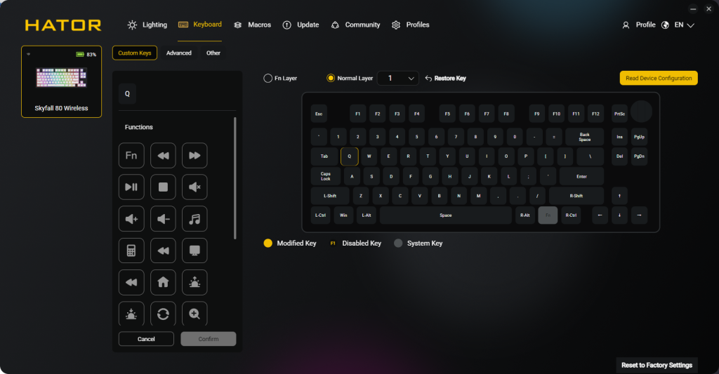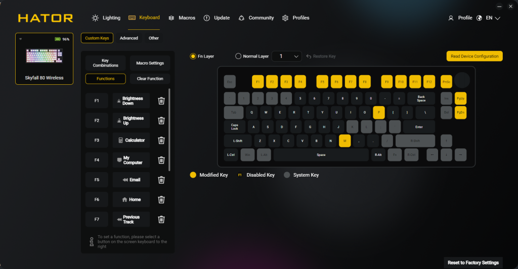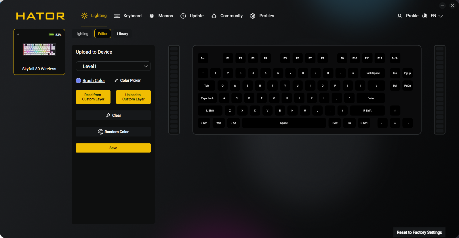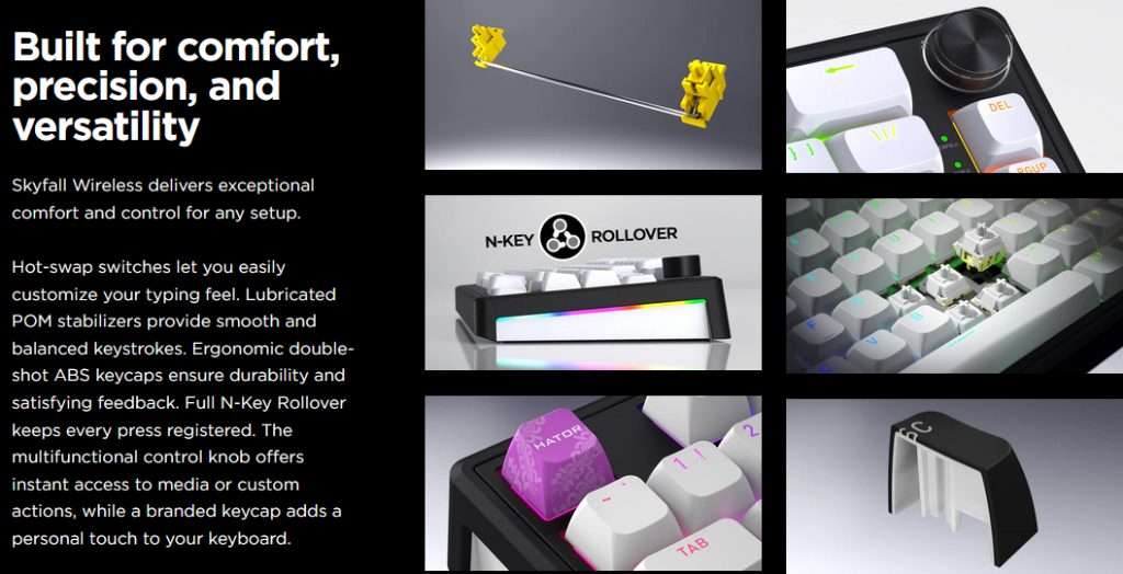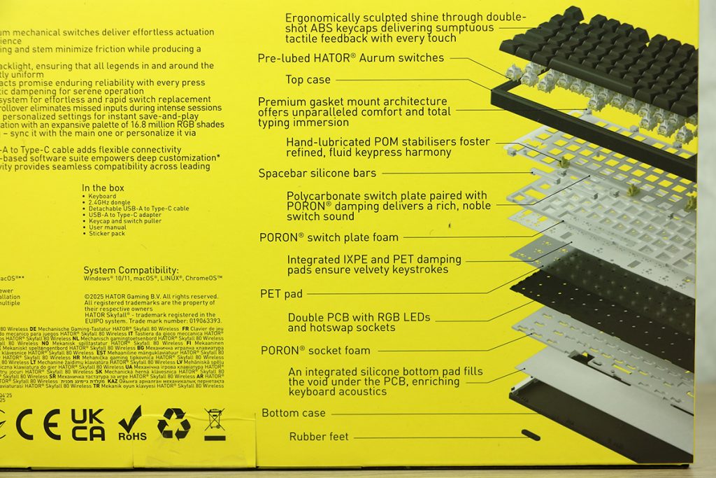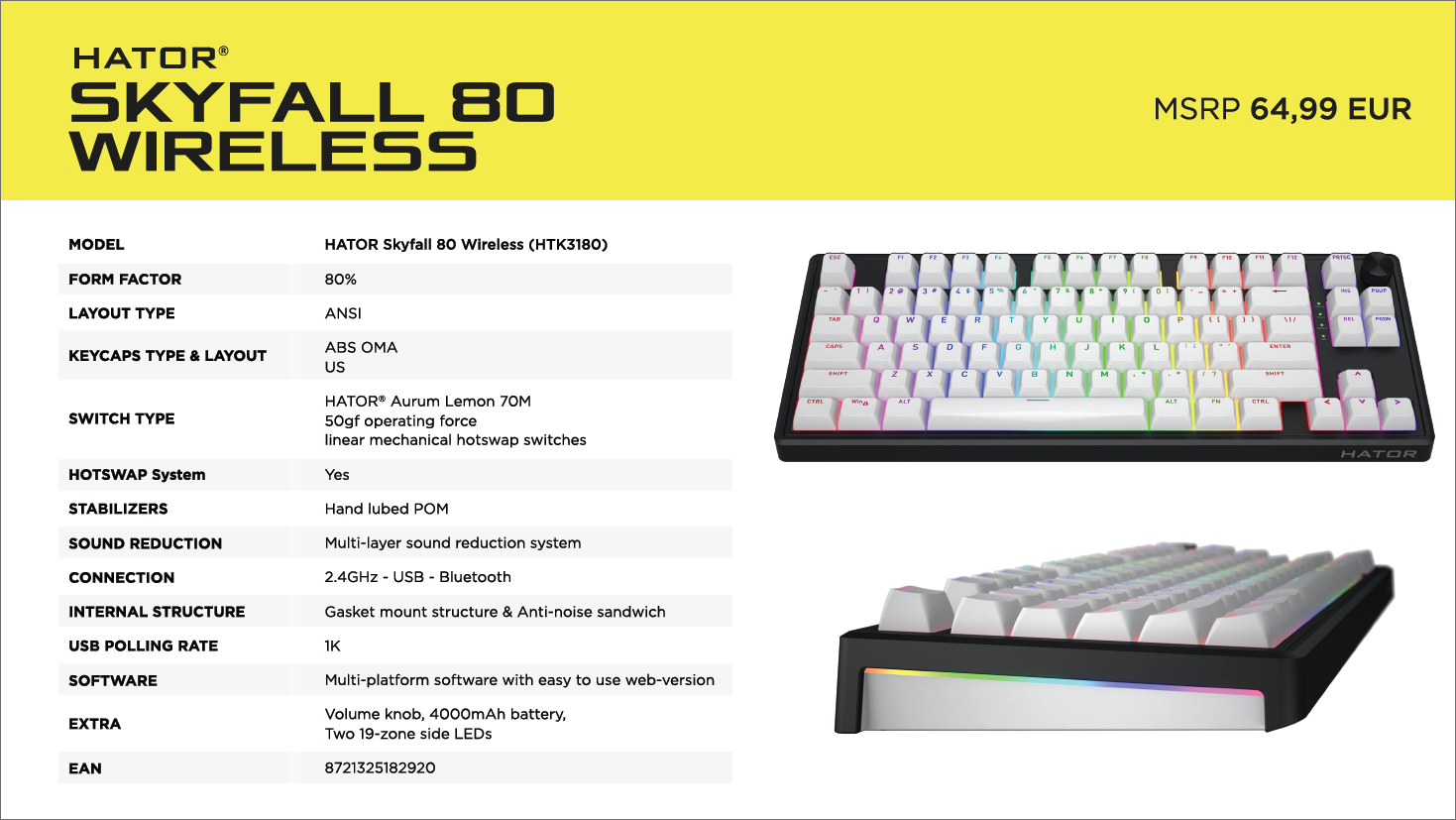 ToetsenbordenHATOR Skyfall 80 Wireless review 29 december 20252 views0Share By Rooieduvel ShareHATOR Skyfall 80 Wireless9.2De HATOR Skyfall 80 Wireless is een betaalbaar mechanisch toetsenbord die het numerieke gedeelte moet missen. Het missende gedeelte wordt keurig opgevangen door sneltoetsen toe te voegen. Het bord typt lekker en is redelijk stil voor zijn doen. De verlichting komt mooi door de toetsen heen en geeft een soort gloed rondom de toetsen en aan de zijkanten van het bord. Bovendien zijn de switches te wisselen voor een andere variant mocht je dit willen. Het bord is op drie verschillende manieren aan te sluiten en is ook te gebruiken op een Mac machine. Het wit kan wellicht snel vuil worden en de behuizing is van plastic maar de prijs moet ergens vandaan komen. De software werkt eenvoudig maar heeft nog een beetje werk nodig. Een prima mechanisch toetsenbord voor €65,-TopVerhouding Prijs/kwaliteit is primaTypt soepelRGB ziet er prima uitVeel sneltoetsen waardoor software niet echt nodig isOp drie verschillende manieren te verbindenMultimedia knopSwitches zijn te wisselenSoftware is duidelijk en helderFlopWitte toetsen kunnen snel vuil wordenBehuizing van plasticSoftware heeft soms nog wat tweaks nodigOm het bprd bedraad te kunnen gebruiken moet je wel de schakelaar omzettenVoordat we met deze review starten wil ik HATOR bedanken voor het beschikbaar stellen van dit toetsenbord. Dit is het eerste product wat ik ontvang van dit (voor nu nog) redelijk onbekende merk.HATOR… vermoedelijk heb je nog nooit van dit merk gehoord. Ik kwam het merk tegen op de lijst van fabrikanten die op de IFA 2025 zouden staan en zag dat het een Nederlands bedrijf was. Uiteraard is er dan de interesse om een afspraak te maken en even te gaan praten. Het blijkt dat het merk al enige tijd bestaat en van origine niet Nederlands is. Het merk is in 2015 ontstaan in Oekraïne en is in een aantal jaar tijd gegroeid als merk zijnde. Het merk maakt producten zoals toetsenborden, headsets, muizen en gaming stoelen, iets wat veel bedrijven tegenwoordig in het assortiment hebben. In 2024 is het merk zich uit gaan breiden naar de rest van Europa en heeft tegenwoordig het kantoor in Nederland gevestigd.Het merk moet het voornamelijk hebben van het modden (aanpassen) van producten en dat is iets wat bij toetsenborden vrij makkelijk kan. Zo is het mogelijk om de switches en de keycaps te vervangen maar ook de verlichting te veranderen. Het laatste is bij vrijwel elk toetsenbord mogelijk en het wisselen van switches kan tegenwoordig ook steeds vaker. Maar wat wel interessant is is het bedrag wat je voor een bord moet neertellen. Meestal kosten borden die aan te passen zijn best veel geld en dat is iets waar HATOR een verandering in wilt brengen. Het moet namelijk mogelijk zijn voor iedereen om goede randapparatuur te hebben voor een schappelijke prijs, waarbij uiteraard wel gekeken moet worden naar de kosten van de hardware.In deze review gaan we het hebben over een 80% toetsenbord, te weten de Skyfall 80 Wireless. Een draadloos toetsenbord met verlichting, aan te passen switches en een draaiknop. De prijs zal je wellicht nog het meest verbazen: deze ligt namelijk op slechts €64,99. Wat je daarvoor terug krijgt en of het bord zijn prijs kan rechtvaardigen gaan we zien in deze review.SpecificatiesUnboxingSoftwareErvaringConclusieVoordat we het bord uitpakken gaan we eerst kijken naar de specificaties en de features.Het overzicht laat niet alles zien van de specificaties. Dit is slechts een deel wat HATOR laat zien in hun folder. Meer informatie is te vinden op hun website. We zien in dit gedeelte in ieder geval al dat we te maken hebben met een 80% toetsenbord wat betekent dat je een deel van de standaard toetsen zult missen. In ieder geval is het hele numerieke gedeelte weggehaald en ook een paar van de toetsen boven de pijltjes zijn weg. Dat is echter een keuze die je zelf maakt en het maakt het toetsenbord wel een stukje kleiner. Uiteraard is er de ANSI layout voor Europa te krijgen. De keycaps zijn gemaakt van ABS en dat is een keuze die gemaakt is om het bord toch betaalbaar te maken. PBT is duurzamer maar ook meteen duurder. Het bord is voorzien van meerdere lagen geluiddempend materiaal om ervoor te zorgen dat het typen zo min mogelijk geluid maakt. Hoe dat klinkt komen we later op terug. Het bord kan verbinden via Bluetooth maar ook met de meegeleverde dongel en uiteraard via een kabel als het nodig is. Verder zien we dat het bord voorzien is van een draaiknop voor het bedienen van het volume. Uiteraard is er ook software aanwezig voor het bord, zowel voor op de computer als online.De switches die gebruikt zijn zijn door HATOR zelf ontwikkeld. We hebben het hier over de Aurum Lemon mechanische switches die van tevoren geolied zijn. De operating force van deze switches zijn 50 gramforce, iets zwaarder dan standaard linear red switches. Dit typt lekker licht en elke aanraking is trefzeker. Dankzij een geïntegreerde lens wordt de verlichting nog een versterkt en dus nog beter te zien door de keycaps heen. Dit geeft ook een mooie gloed onder de toetsen zelf. Tevens is het mogelijk om je eigen switches op het bord te gebruiken als je zou willen aangezien de switches te vervangen zijn. Natuurlijk mag N-key rollover niet ontbreken en de eerder genoemde ronde knop maakt het mogelijk om audio te bedienen.Anno 2025 mag verlichting niet ontbreken op een toetsenbord. Het is tegenwoordig zeldzaam als een toetsenbord geen verlichting heeft. De verlichting is netjes over het hele bord afgewerkt en zelfs aan de zijkant van het bord is verlichting te vinden. Deze verlichting is deels aan te passen via het toetsenbord zelf door middel van toetscombinaties maar anderzijds kan de verlichting aangepast worden via de software.Een wat duurder toetsenbord kan uiteraard helemaal naar wens aangepast worden en dat is ook het geval bij de Skyfall 80 Wireless (al zou je het wellicht niet helemaal verwachten bij deze prijs). Zo is